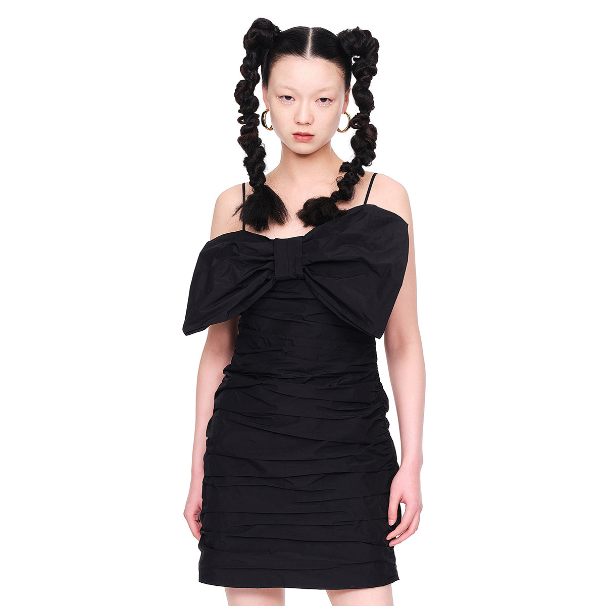 地素夏秋甜酷辣妹黑色蝴蝶结装饰抽褶吊带修身连衣裙 958155