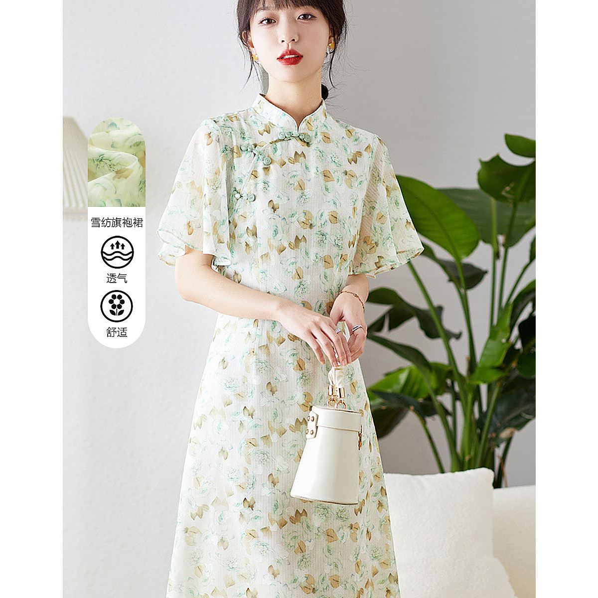 【中式水墨印花雪纺旗袍裙】春秋盘扣荷叶袖开衩连衣裙女 743617