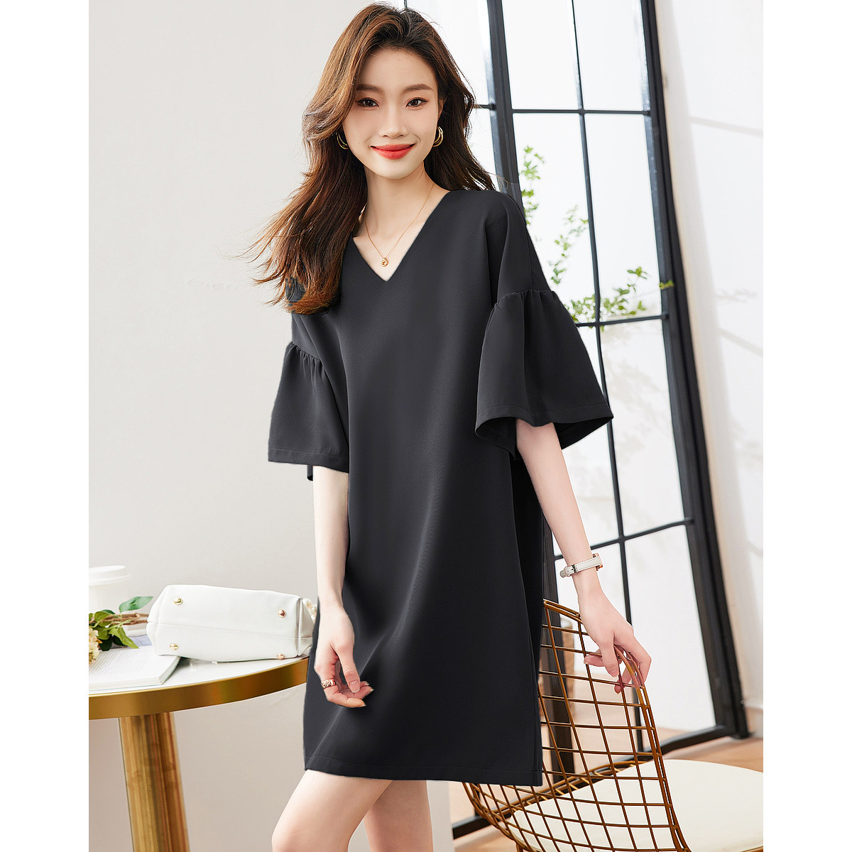 【薄荷曼波系列】夏港风名媛V领喇叭袖舒适藏肉连衣裙女中长款 804289