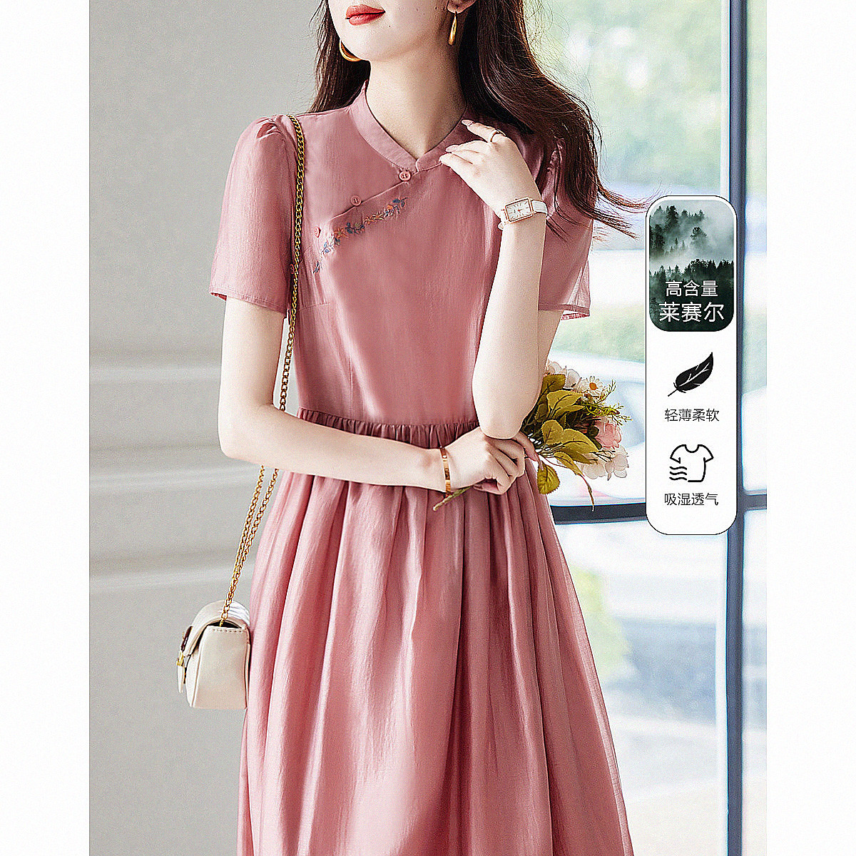 【优雅a字绣花裙】夏季通勤立领纽扣连衣裙女中长款 902657