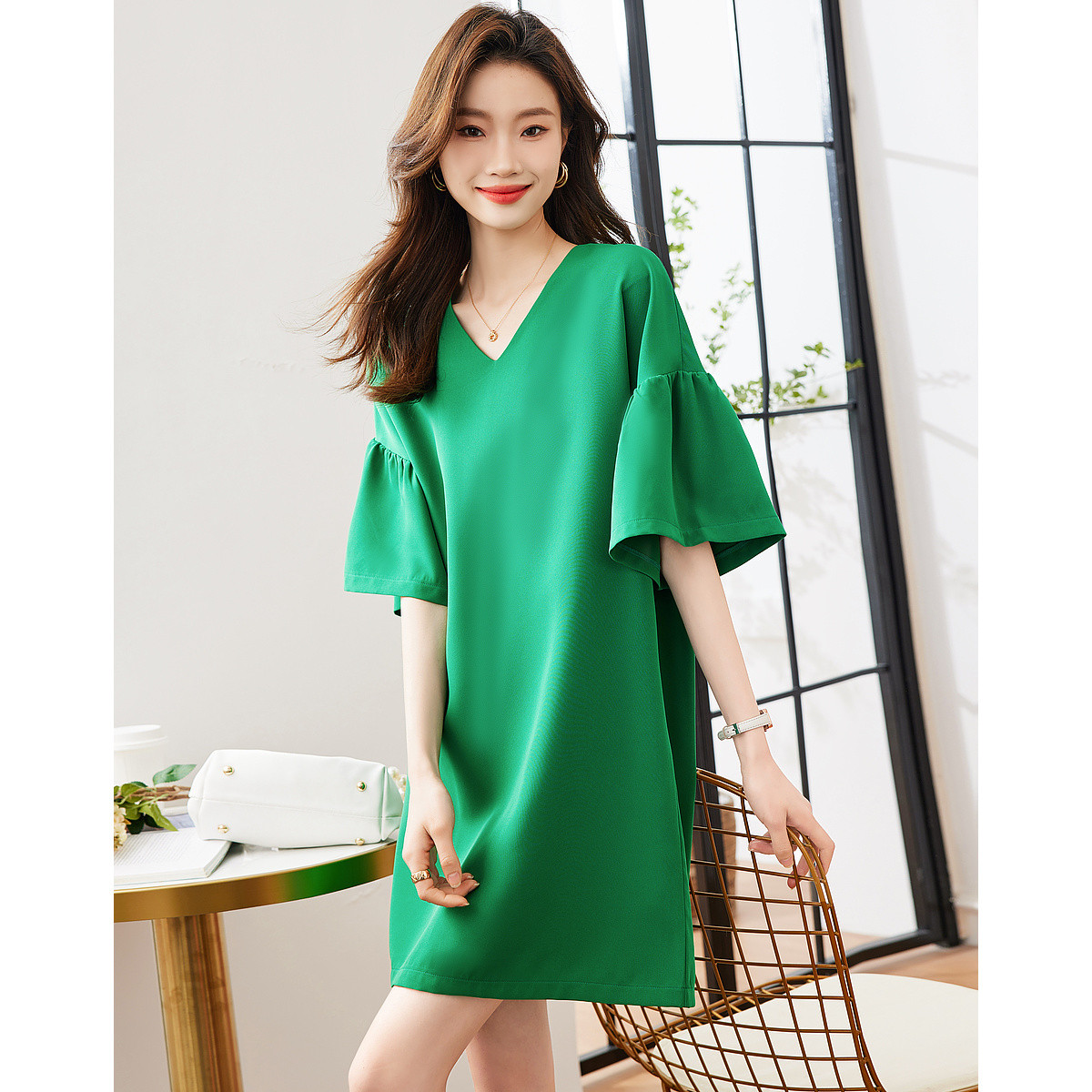 【薄荷曼波系列】夏港风名媛V领喇叭袖舒适藏肉连衣裙女中长款 816577