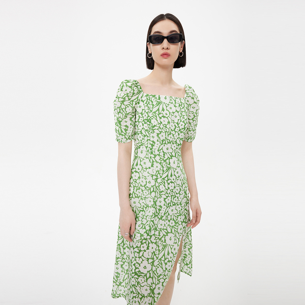 【薄荷曼波】夏季浪漫碎花法式复古方领气质泡泡袖高腰连衣裙 392219