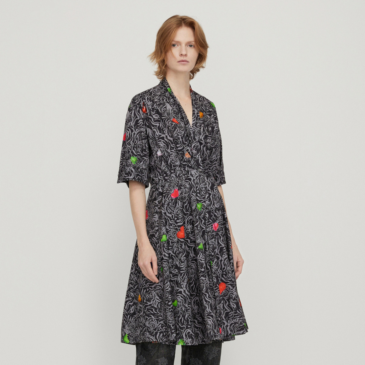 夏连衣裙V领印花棉质五分袖中长裙女伞裙 749131