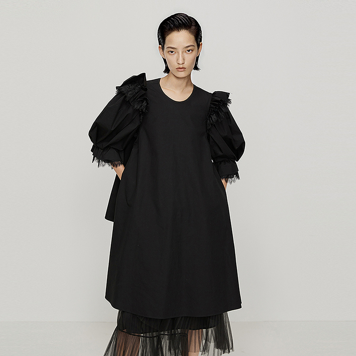 【通勤奏鸣曲】春秋显瘦气质V领收腰鱼尾浪漫花边连衣裙女中长款 404993