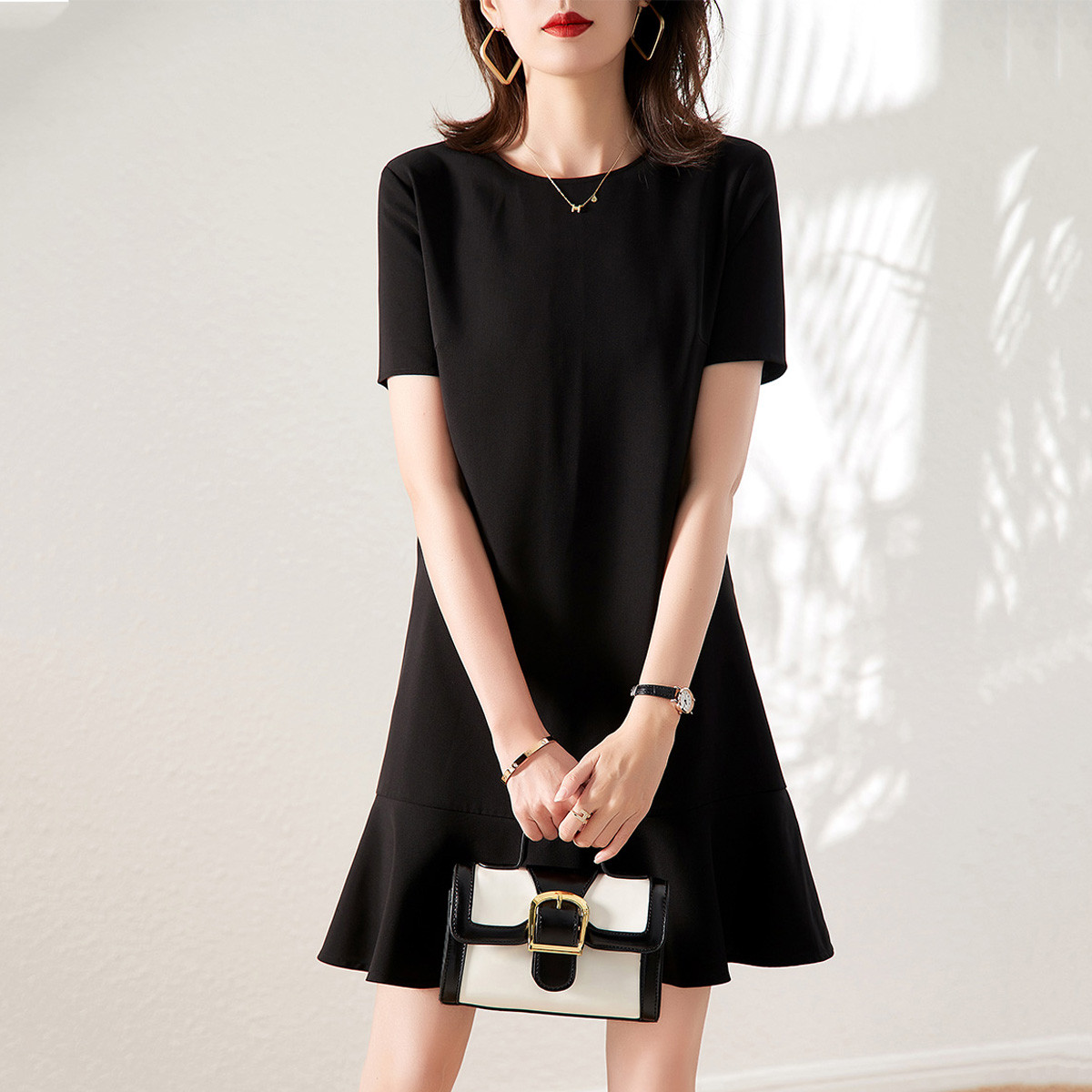 【小黑裙】夏季圆领A型宽松波浪连衣裙女夏 110593