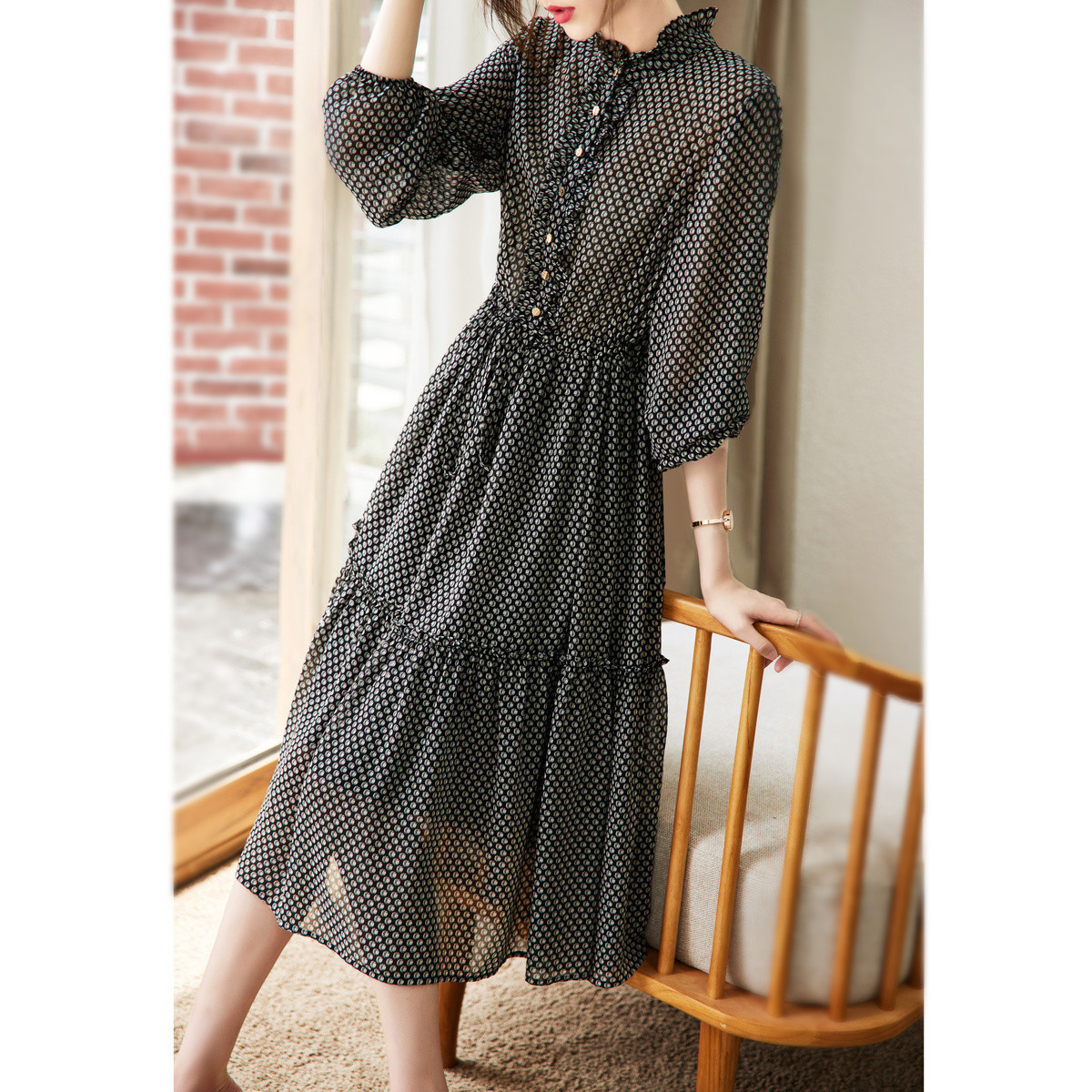【波点高腰名媛风】秋季半高领长袖木耳边抽褶拼接连衣裙女 340673