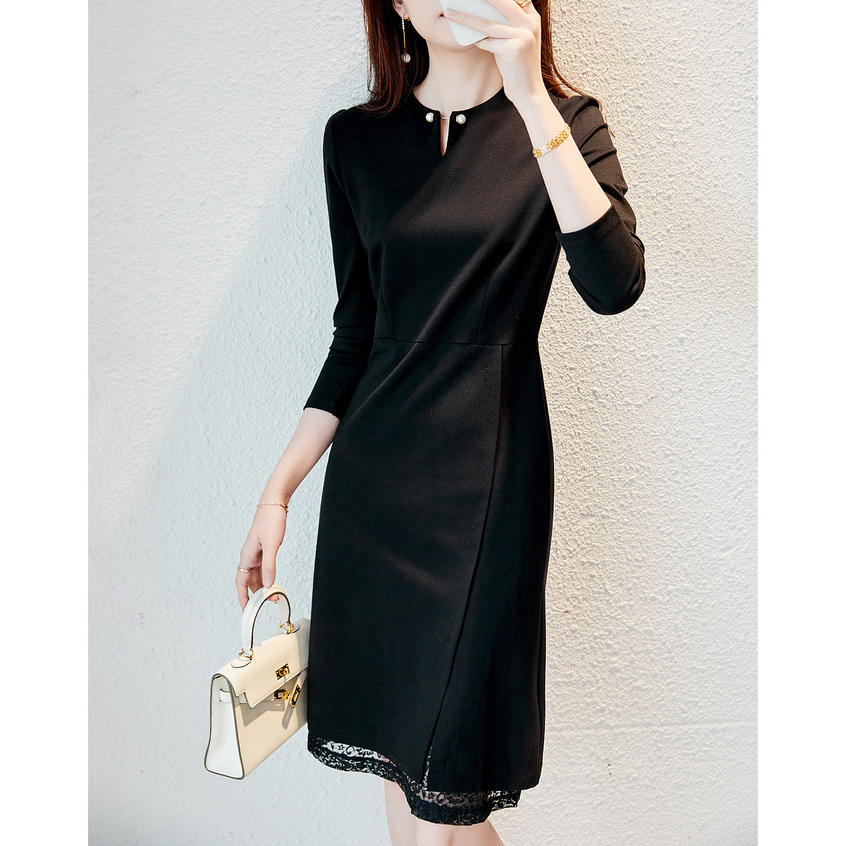 【浪漫出游】春季轻熟风蕾丝拼接开衩圆领长袖A字连衣裙女中长款 005121