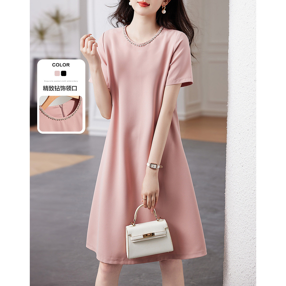 【通勤懒人敲圈粉】春秋精致贴钻圆领简约短袖气质连衣裙女中长款 506625