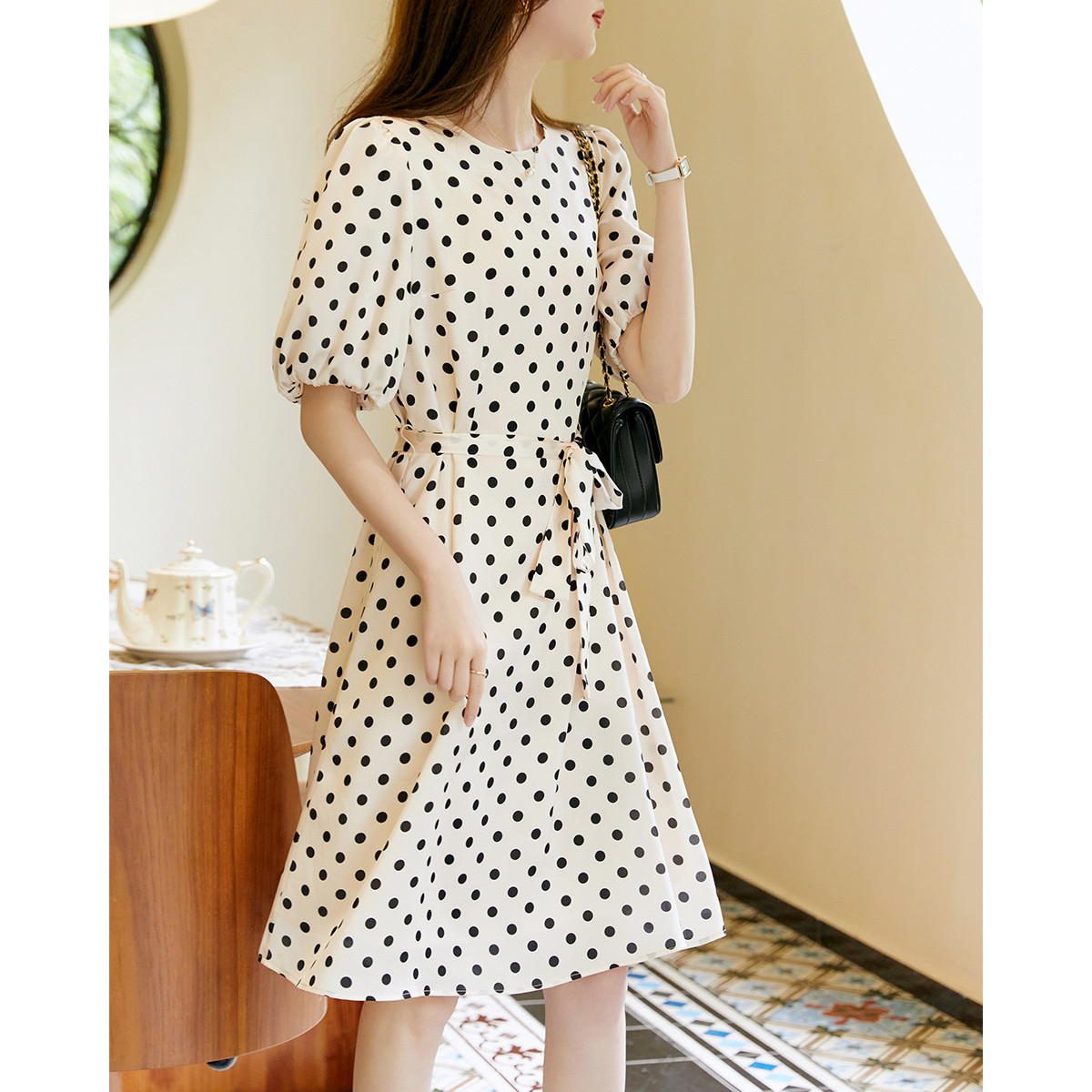 【泡泡缎印花茶歇裙】春秋圆领收腰泡泡袖连衣裙女中长款 626113