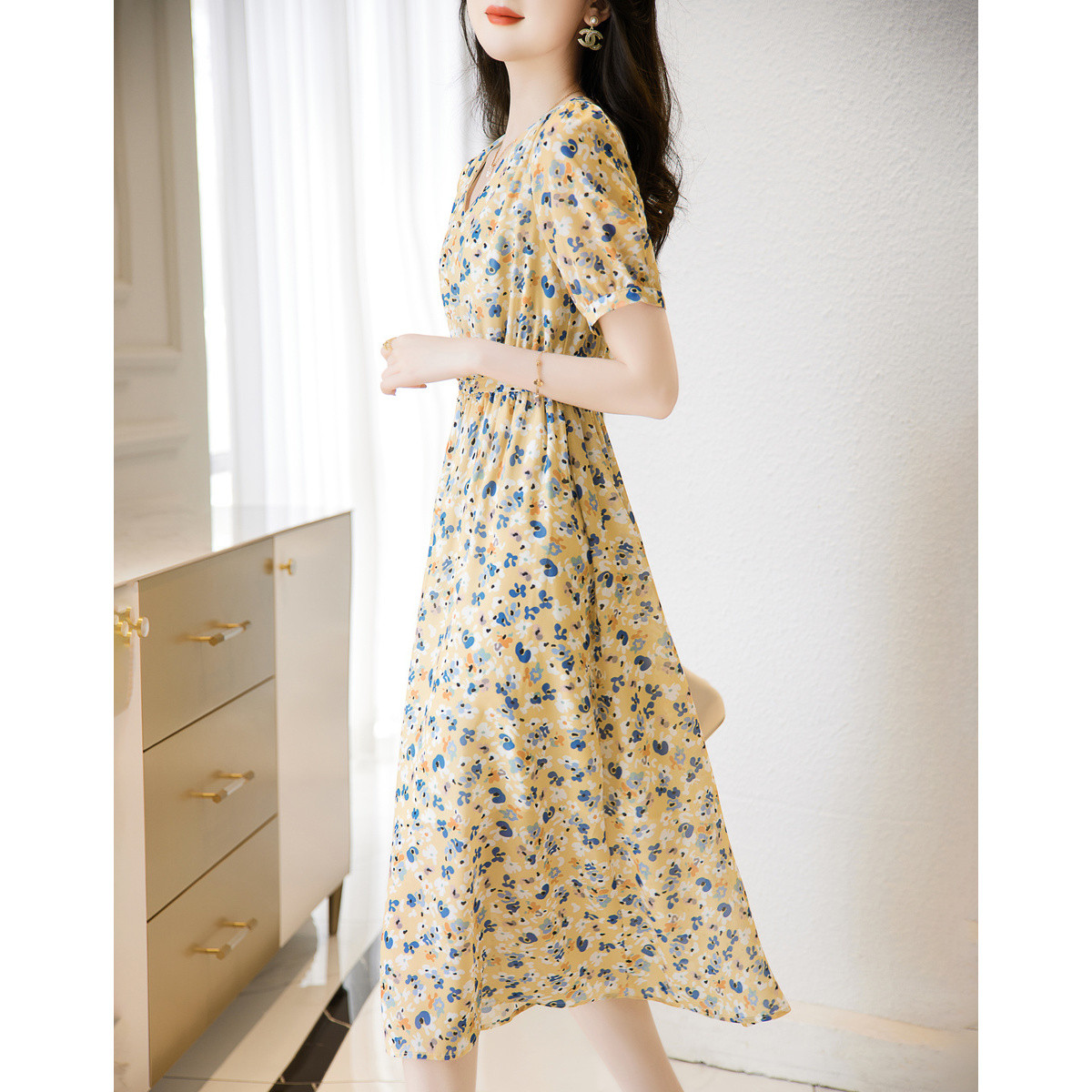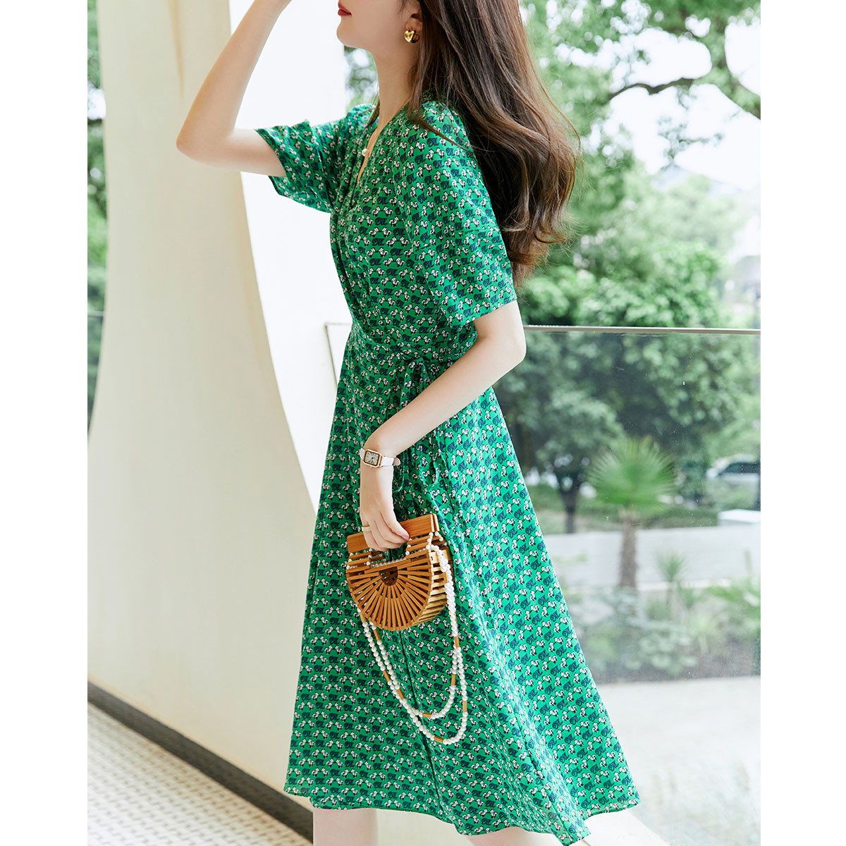 【碎花收腰茶歇裙】夏季V领短袖X型印花连衣裙女中长款 024321