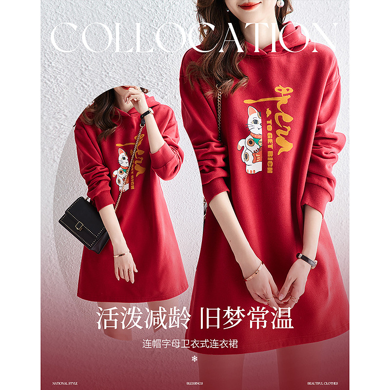 【克莱因蓝】春秋国风新中式连帽字母印花藏肉气质卫衣女连衣裙 923457