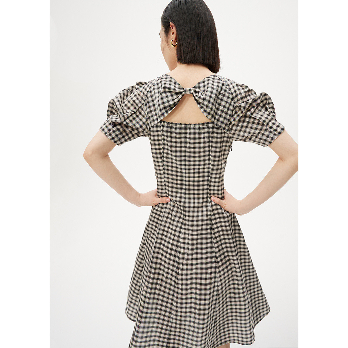 连衣裙气质夏季高级感时尚格纹复古泡泡袖a字高腰连衣裙女 876891