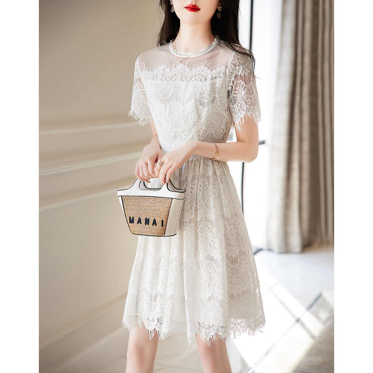 【蕾丝拼接】夏圆领合体不规则须边修身裙子连衣裙女夏 022913