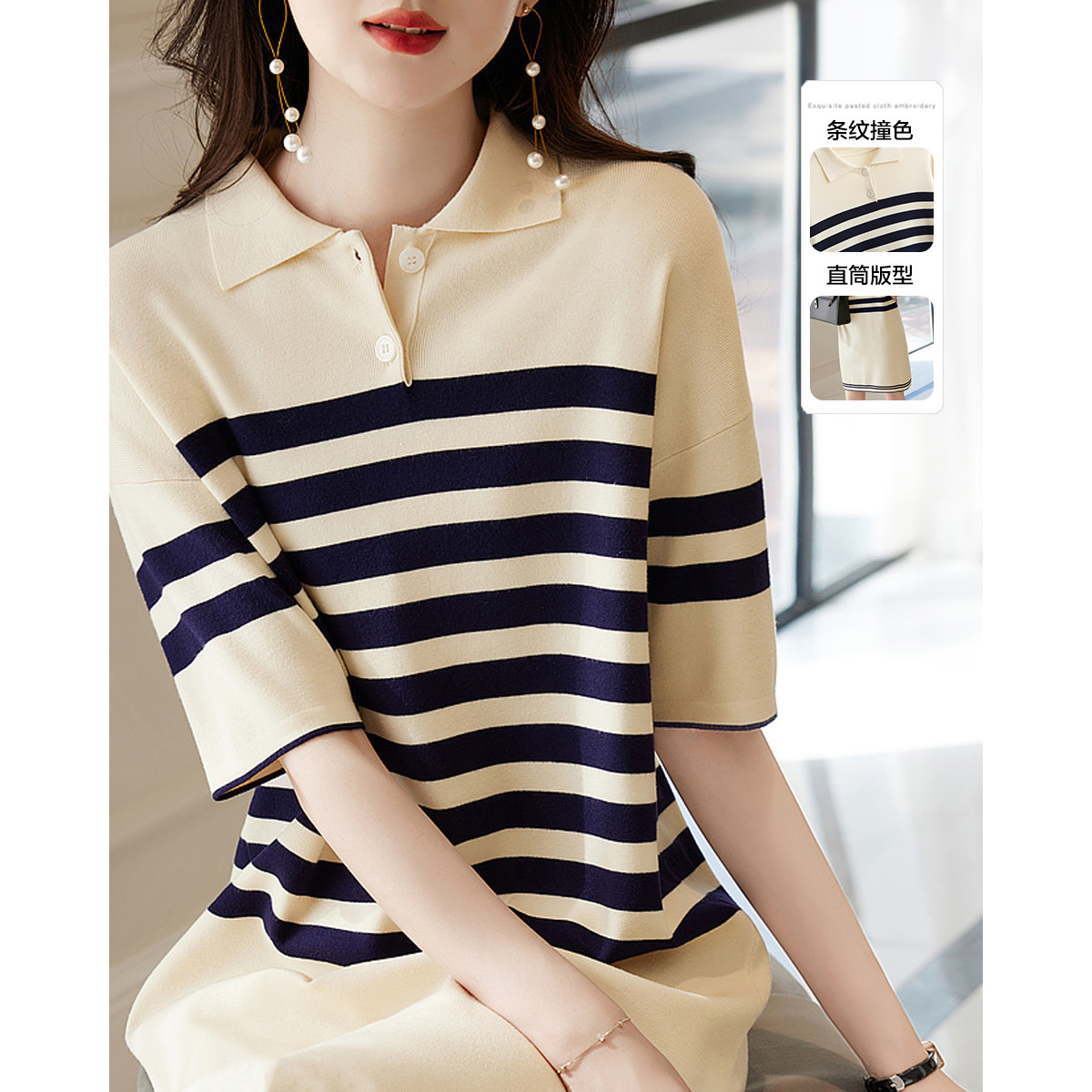 【条纹撞色直筒裙】春秋翻领落肩五分袖连衣裙女中长款 901441