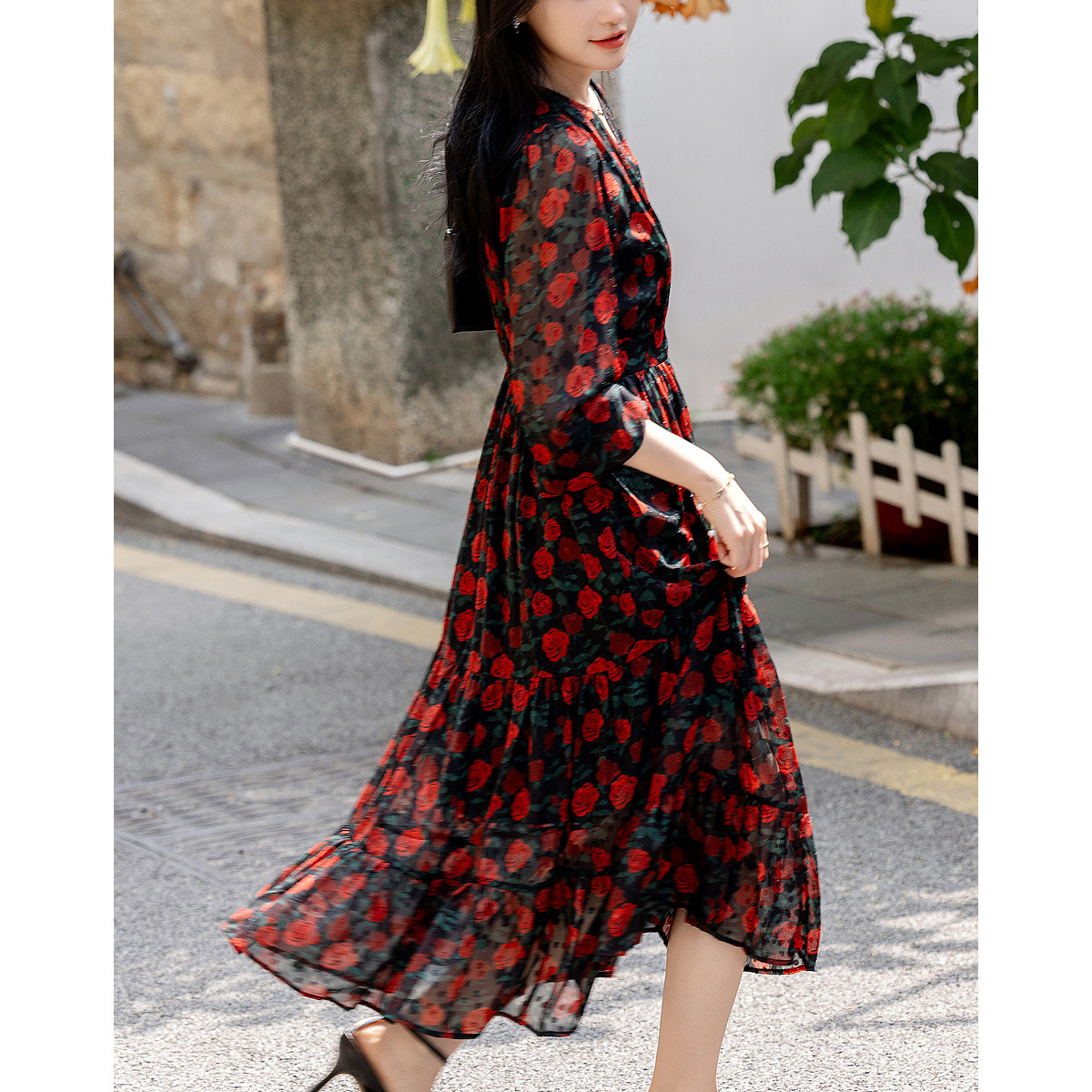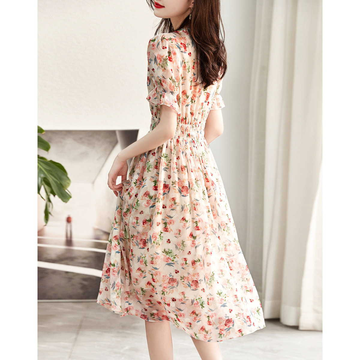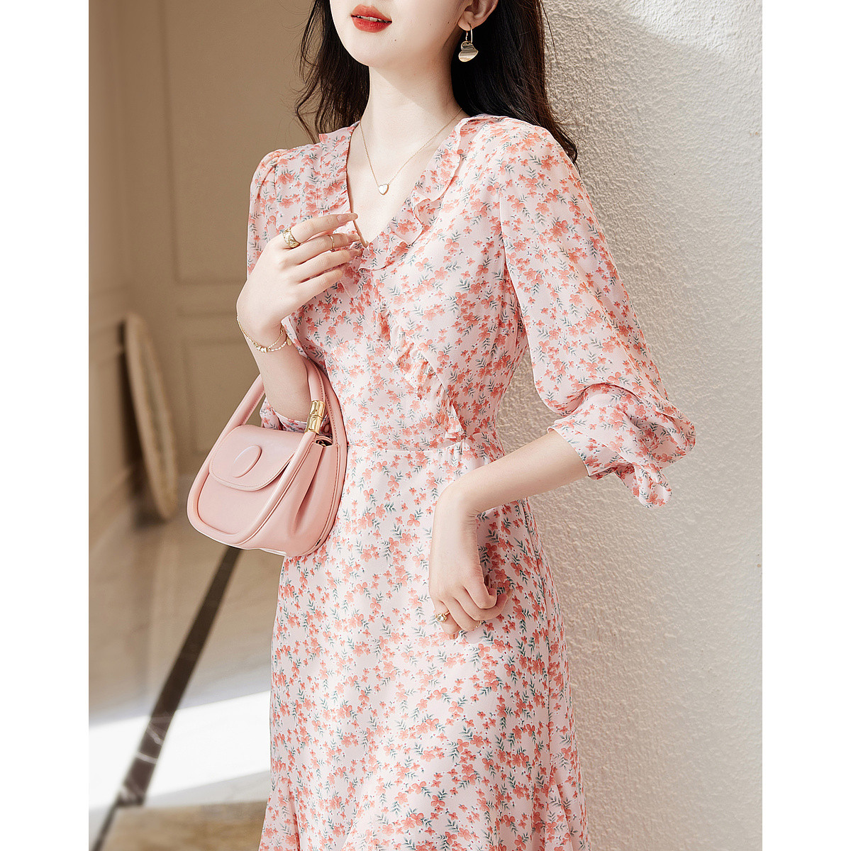 【蔷薇花雪纺伞裙】夏季V领碎花荷叶袖鸡蛋花连衣裙女长款 880641