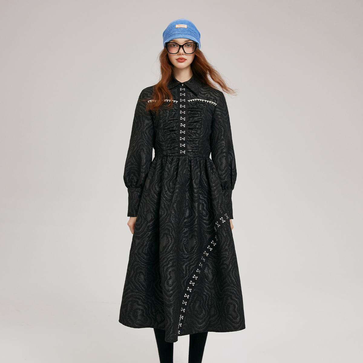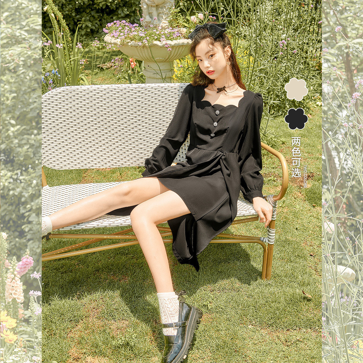 春秋不规则纽扣长袖连衣裙女法式复古高腰波浪裙子 686100