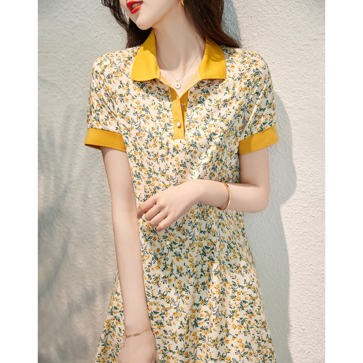 【撞色碎花a字裙】夏翻领三粒扣a字短袖连衣裙女中长款 888833