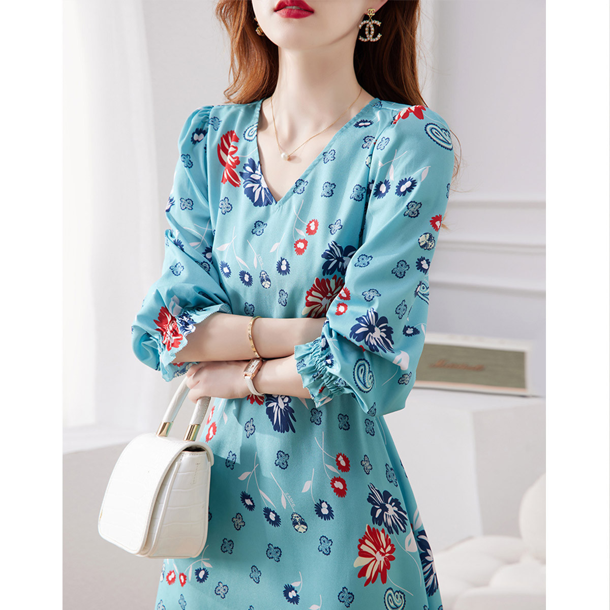 【法式通勤】春秋V领长袖印花抽褶a字连衣裙女 649537