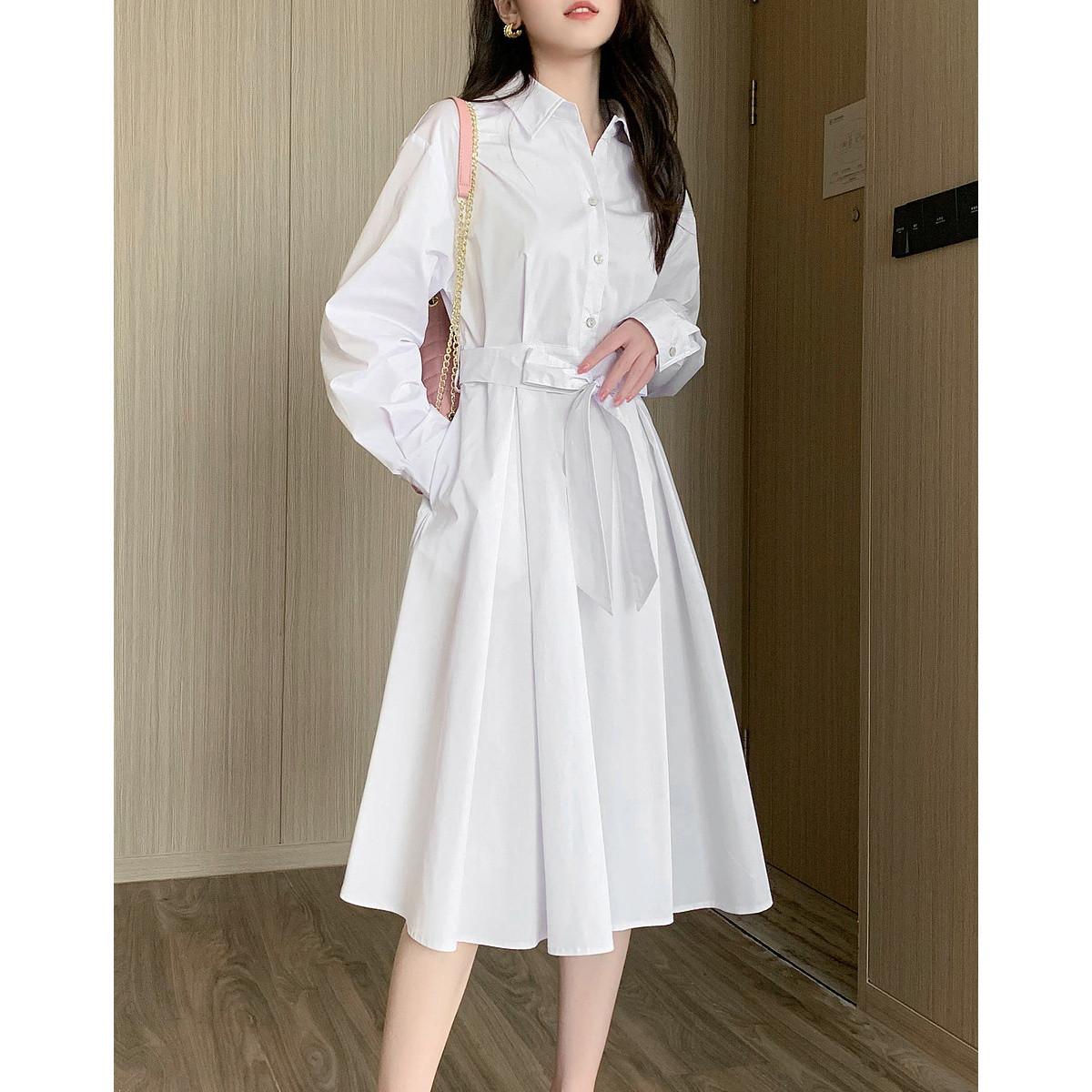 【OL穿搭观察者】春秋法式翻领抽褶绑带收腰优雅衬衫式连衣裙女 847169