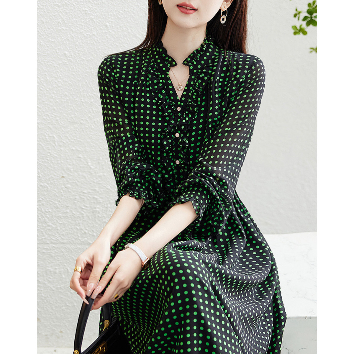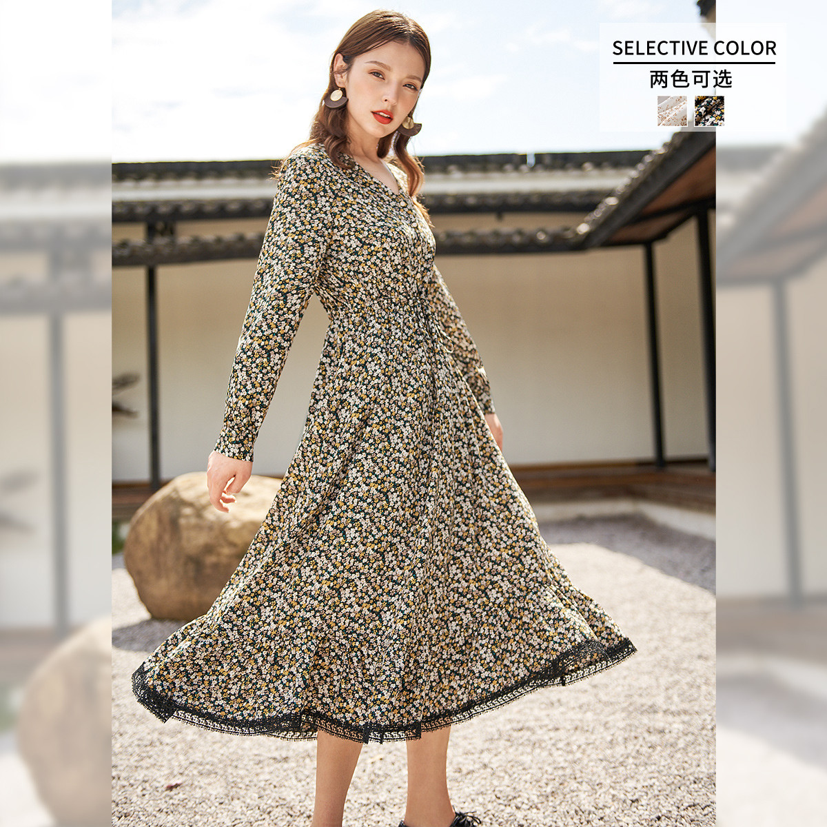【寻迹东方】秋装长袖高腰连衣裙女V领气质中长款裙子 103060