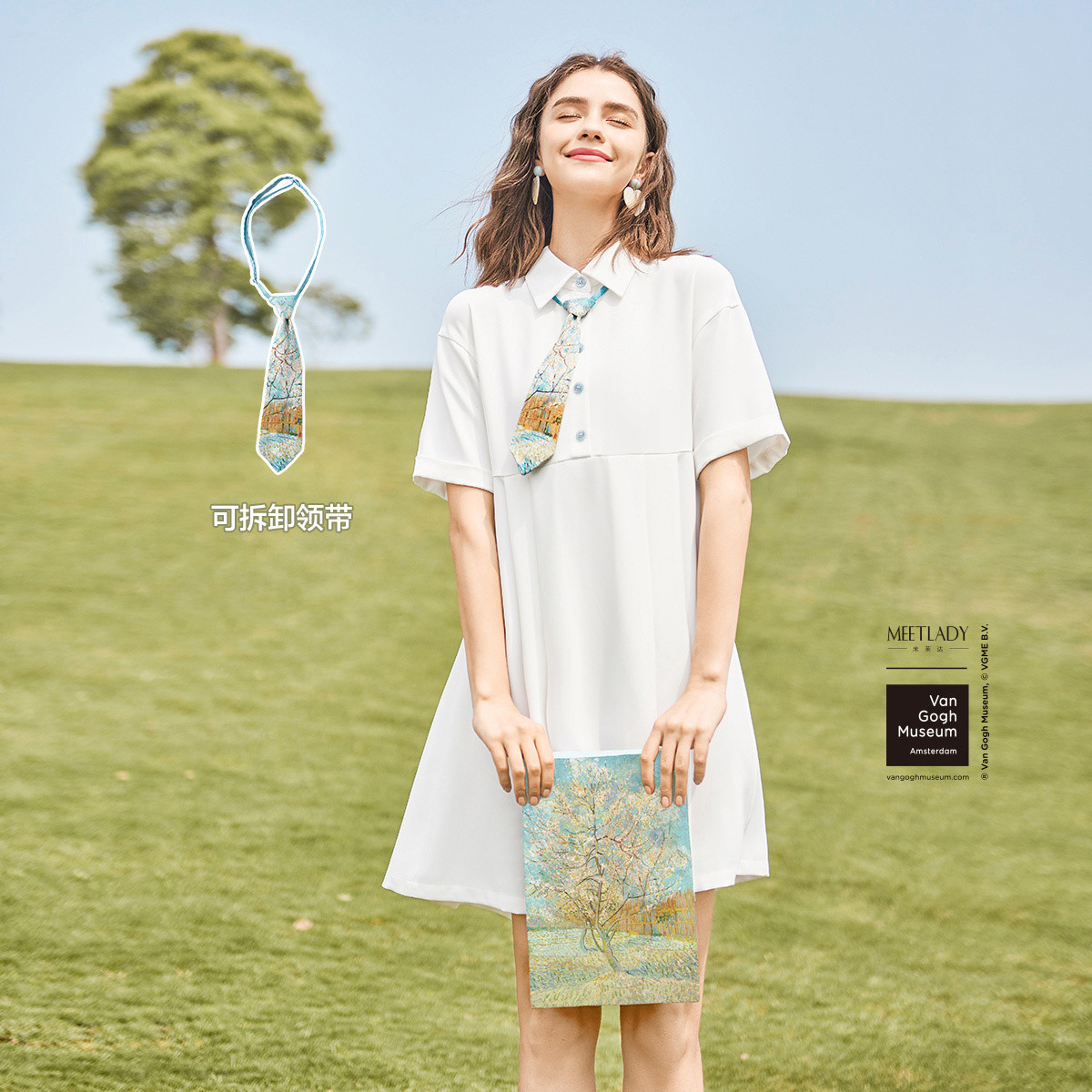 【梵高】夏装学院风连衣裙女显瘦高腰印花领带百褶裙 515220