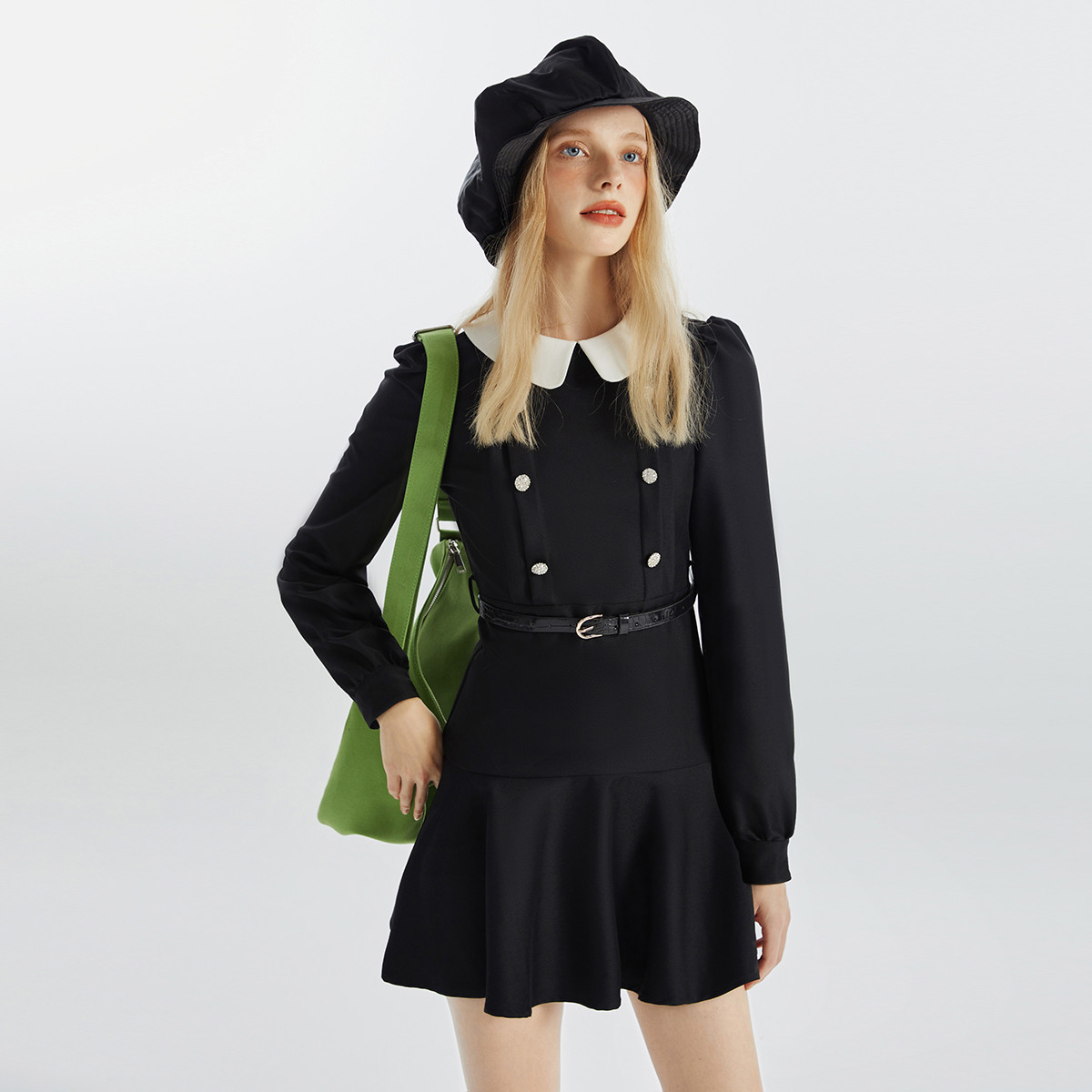 可调节腰带春秋复古学院风连衣裙女娃娃领设计感小众短裙 165332