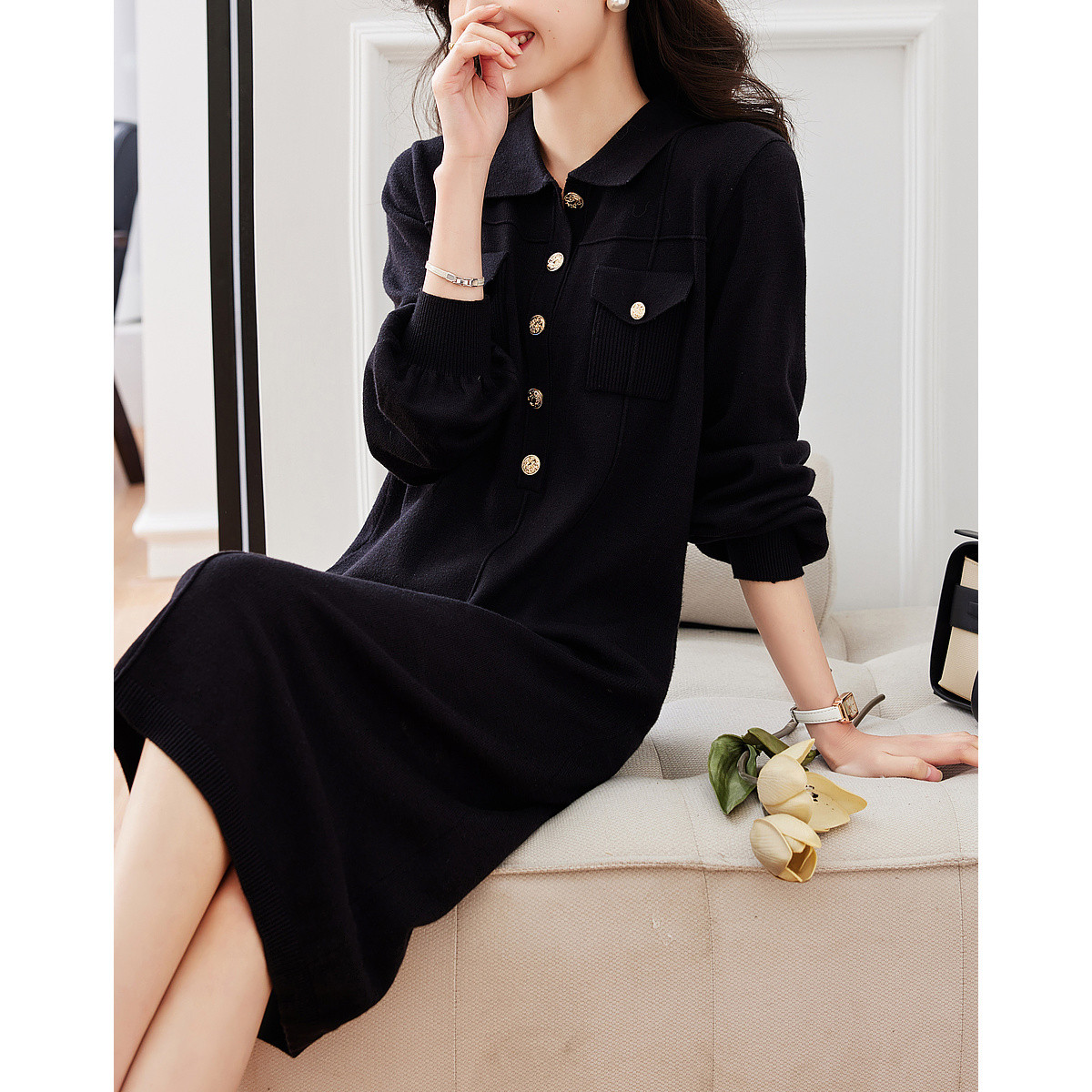 长袖针织裙女优雅气质长连衣裙过膝长裙子 386435