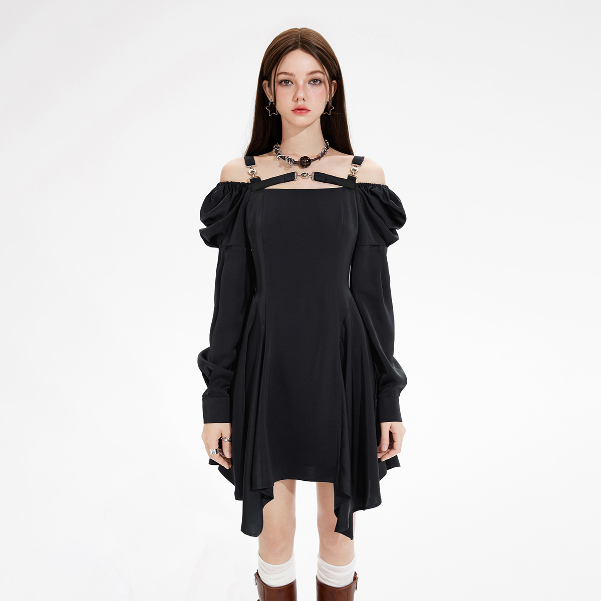 春秋露肩黑色连衣裙女纯欲甜酷设计小众小黑裙 907412