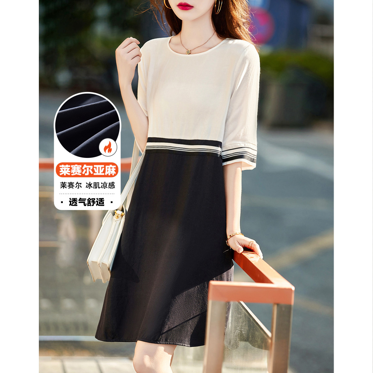 【莱赛尔亚麻】夏季圆领宽松撞拼中袖裙子连衣裙女夏 594625