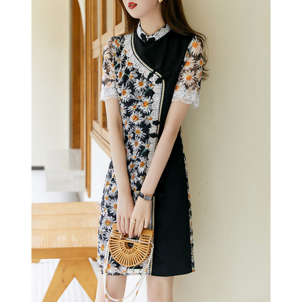 【国风雏菊旗袍裙】夏中式立领盘扣拼接蕾丝a字连衣裙女中长款 964353