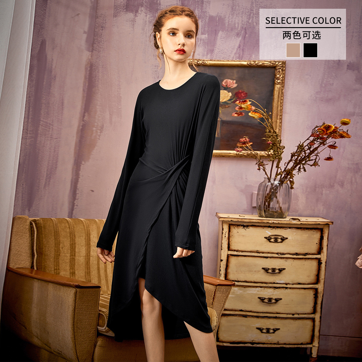 春秋圆领褶皱长袖连衣裙女高腰显瘦不规则中长裙 060436