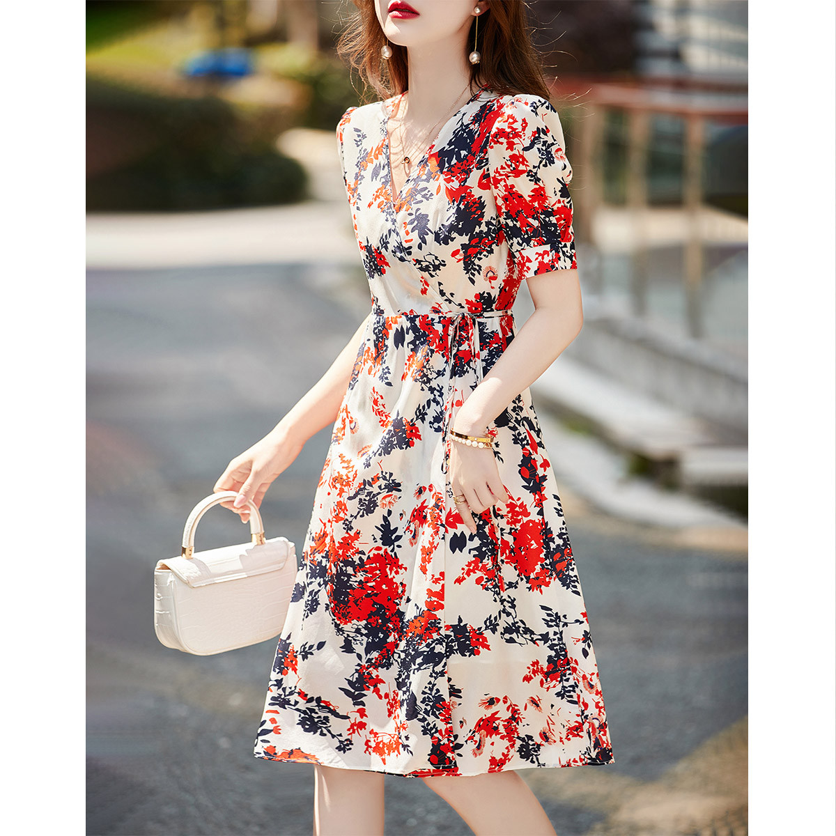 【印花收藏夹】夏法式花漾写意印花V领系绳舒适藏肉女式连衣裙 043969