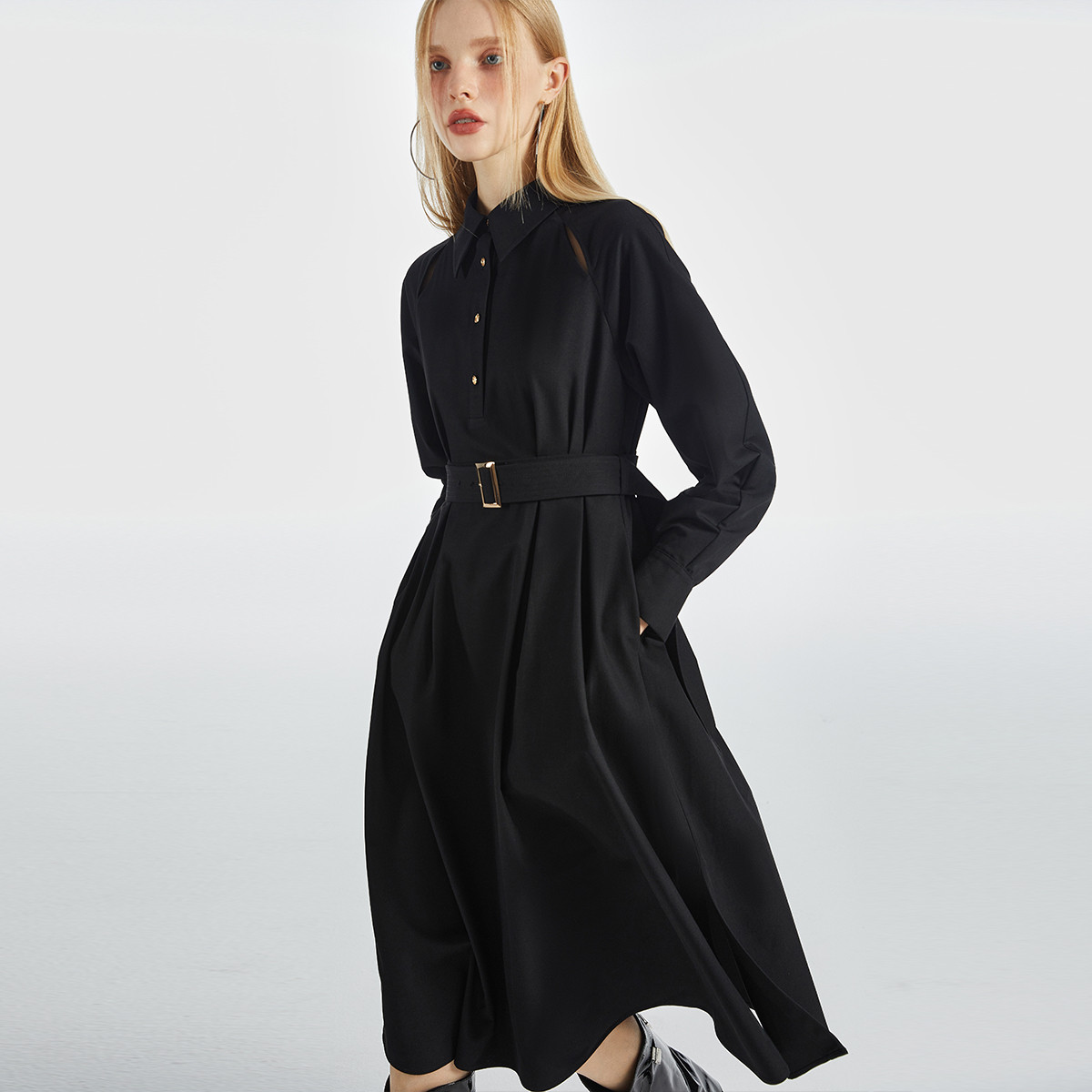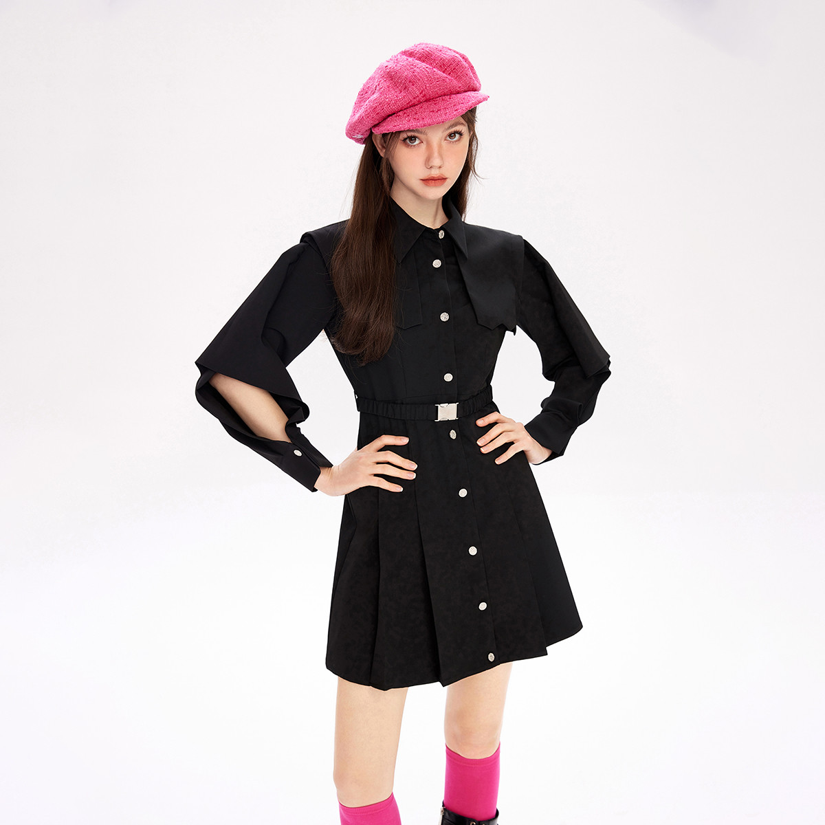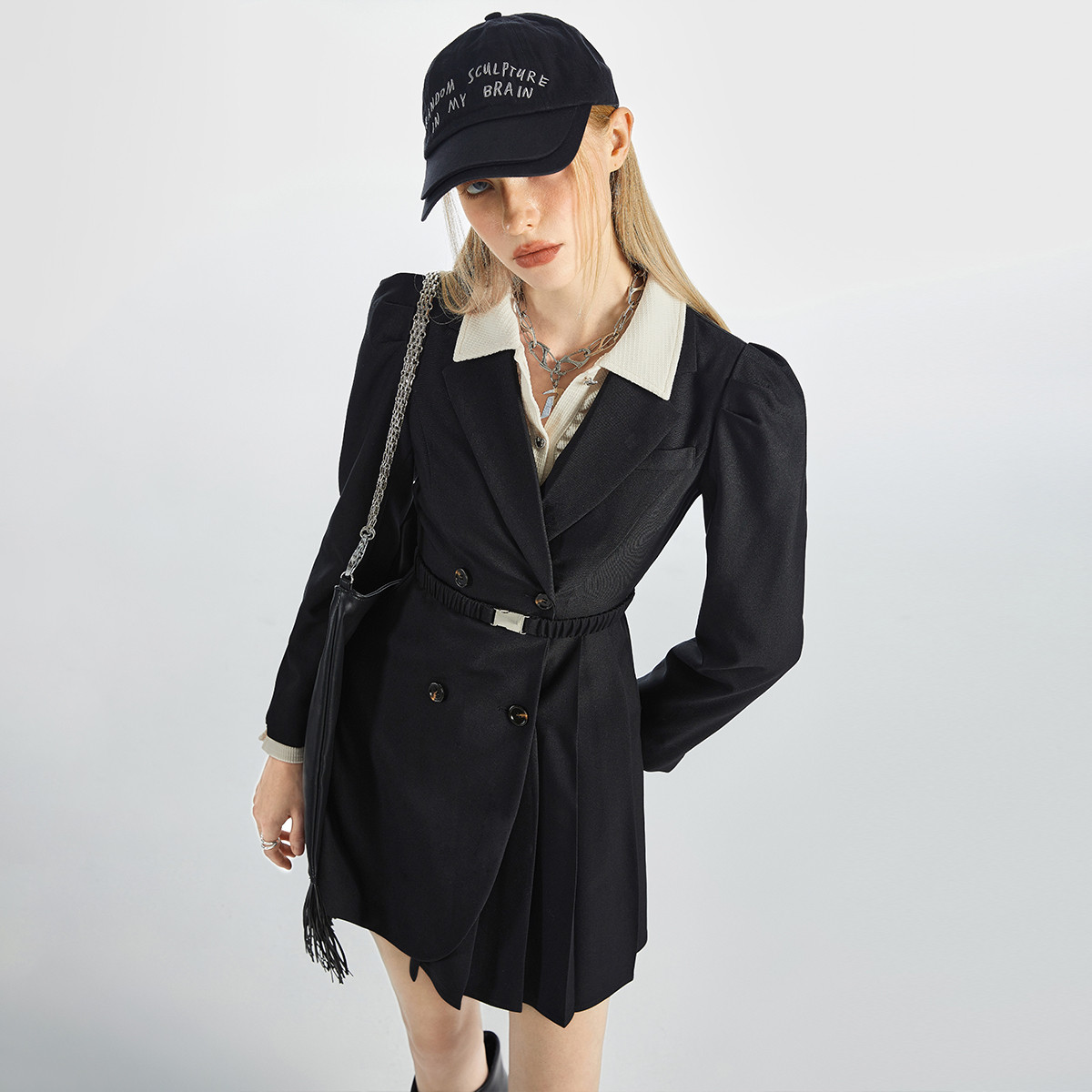 显瘦腰带春秋黑色西装连衣裙女法式收腰长袖百褶裙 545940