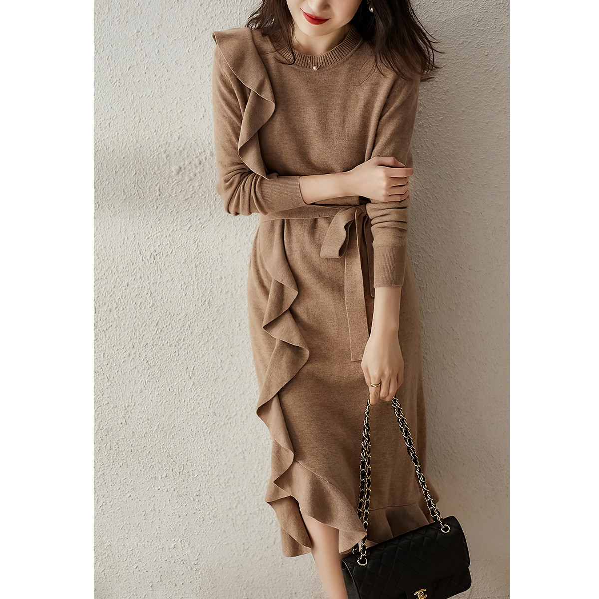 荷叶波浪边长连衣裙百搭显瘦细带长袖针织连衣裙女 294723