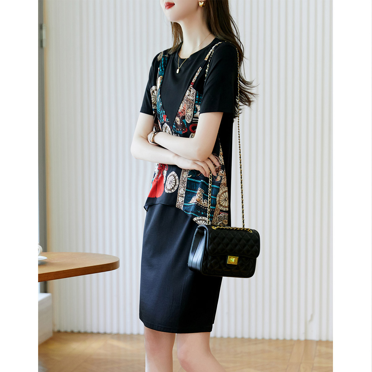 【迷情假日】夏法式假两件拼接180G棉氨针织高清印花连衣裙女 698753
