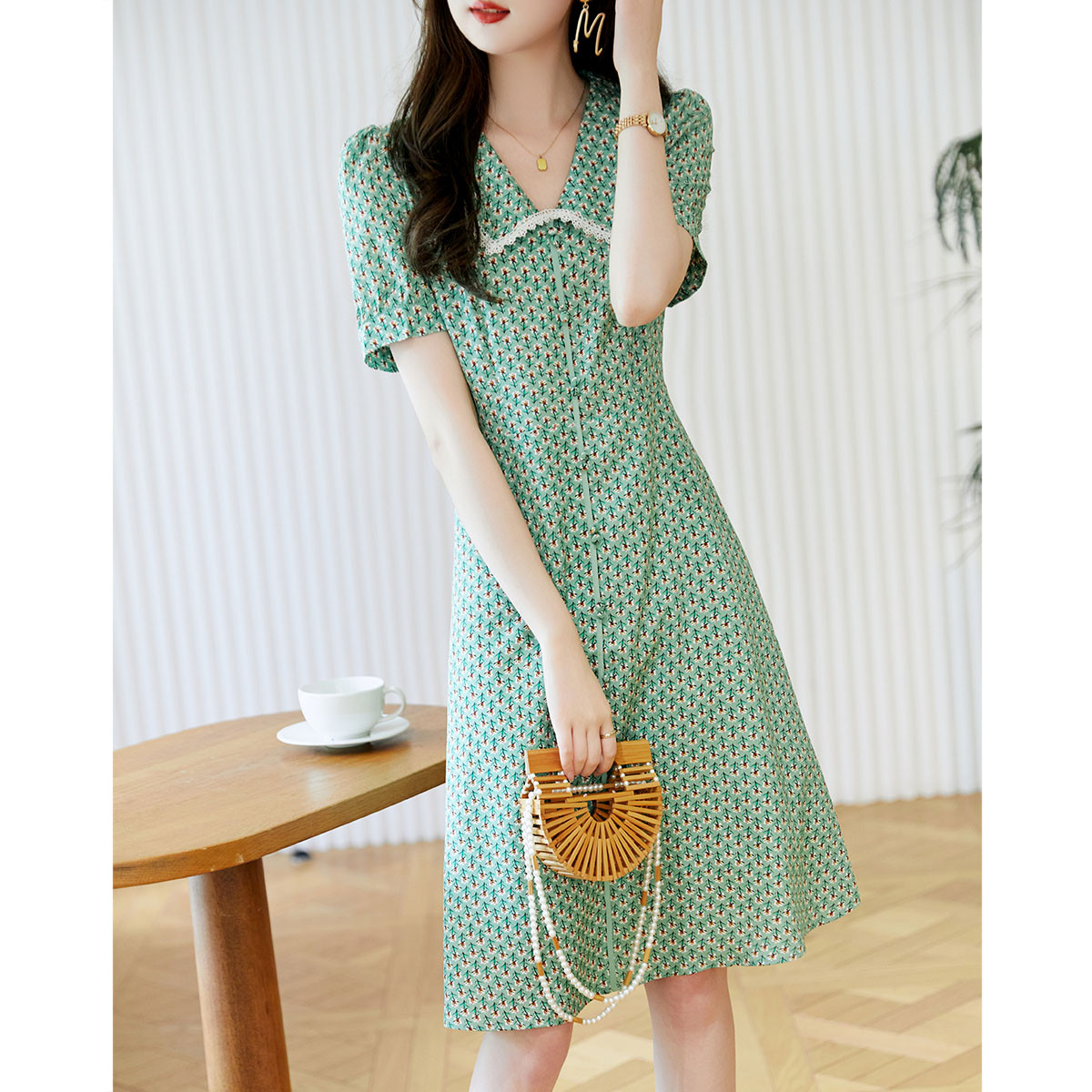 夏装立领拼接花边连衣裙女法式复古印花a字裙 639636