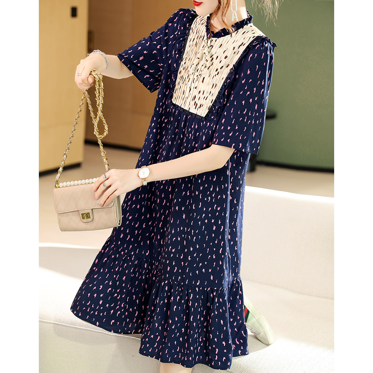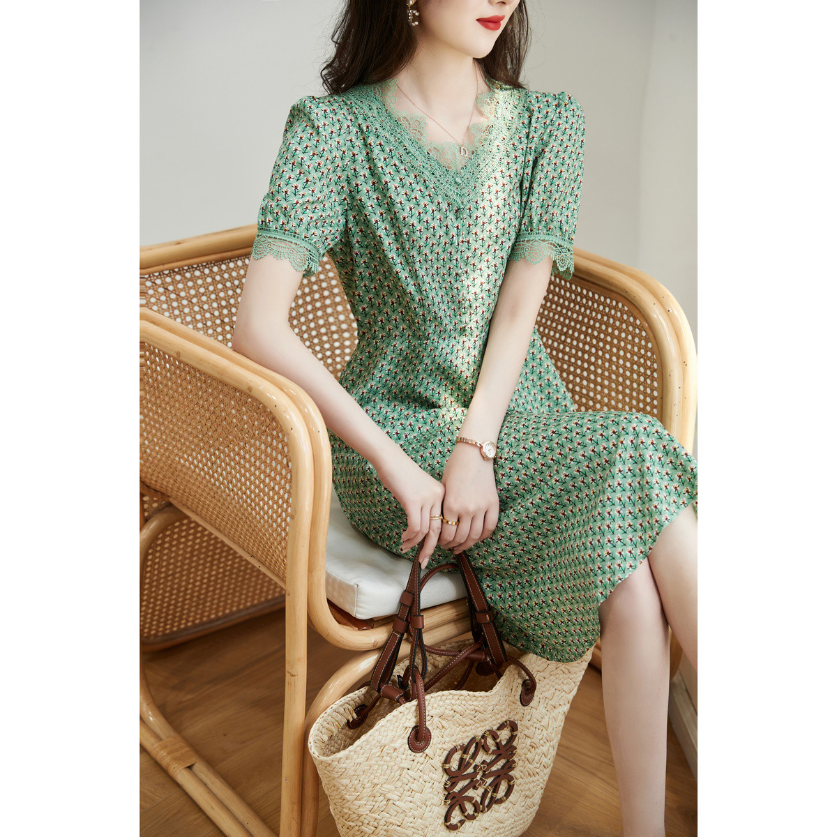 【蕾丝拼接V领茶歇裙】夏短袖印花a字收腰修身连衣裙女 245953