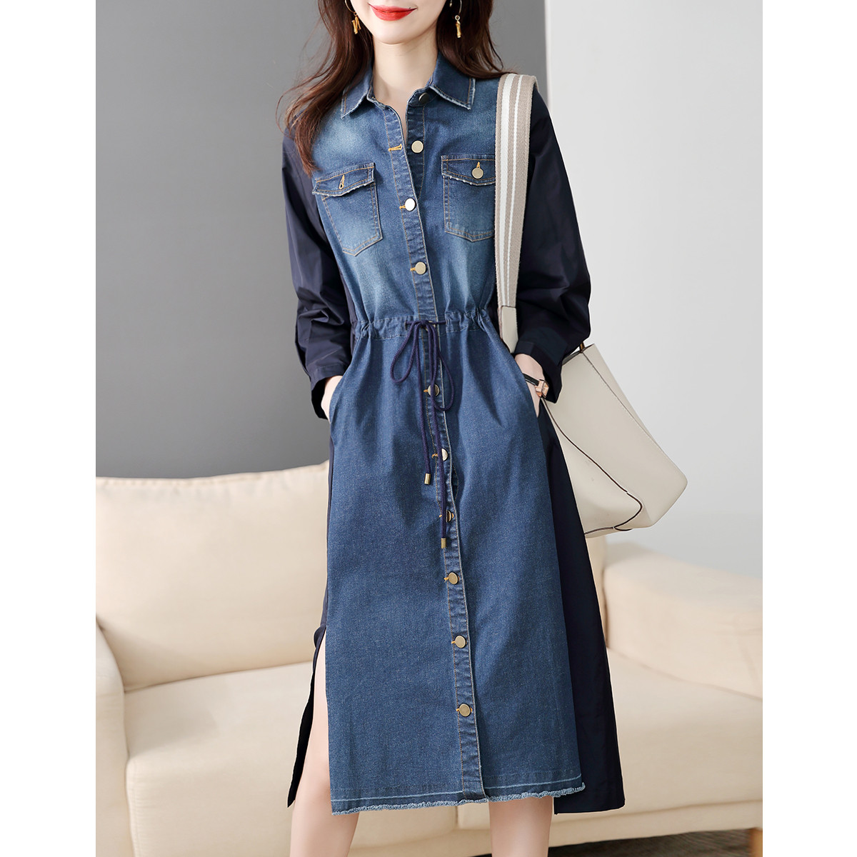 【牛仔拼接】秋系带九分灯笼袖开衩连衣裙秋季女长袖 792001