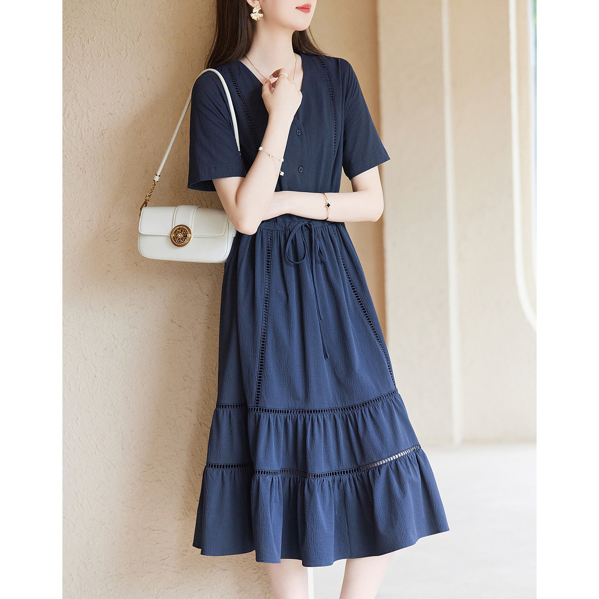 【棉莱赛尔混纺】夏季复古V领绑带荷叶边镂空气质小个子女连衣裙 918529