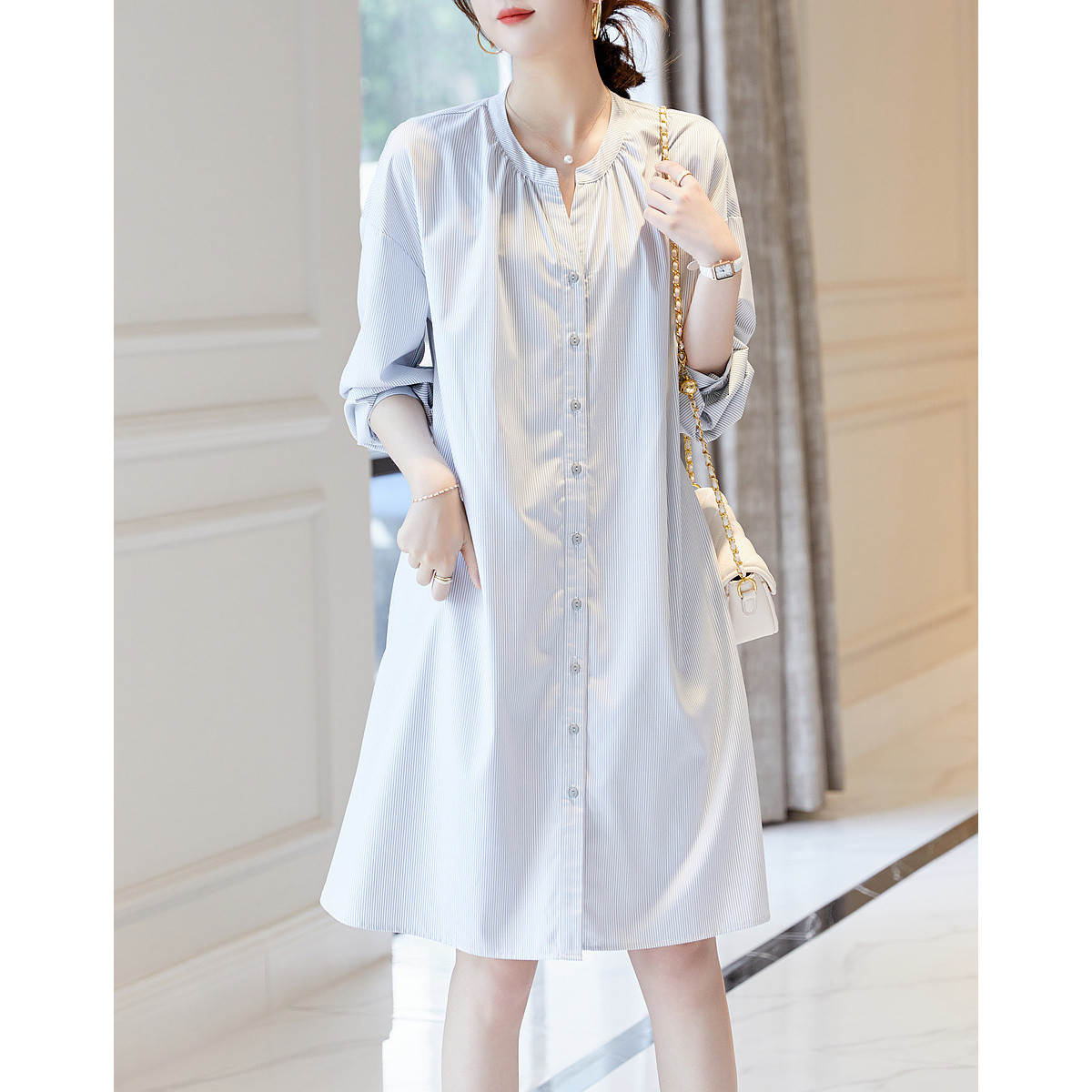 【a字条纹裙】春秋圆领宽松长袖抽褶连衣裙女中长款 322945