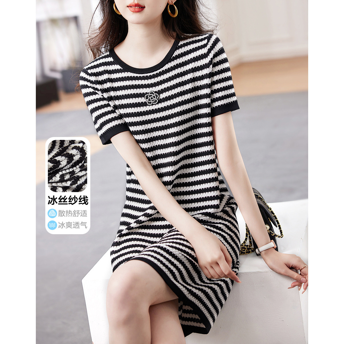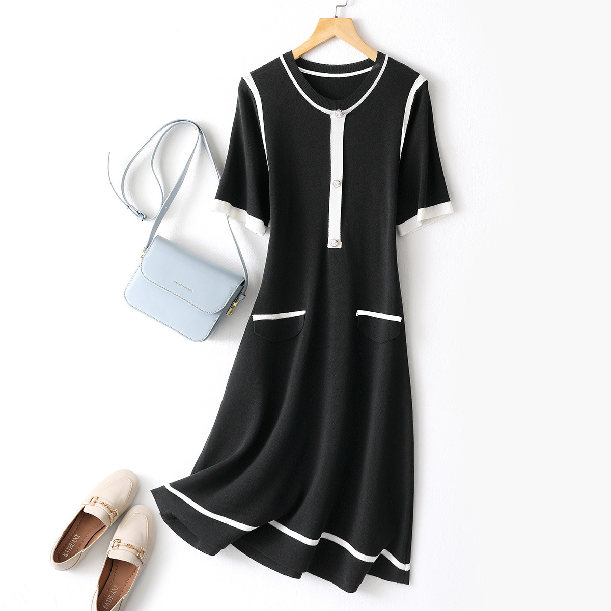 【冰丝连衣裙】夏季套头微弹撞色针织短袖连衣裙 865473
