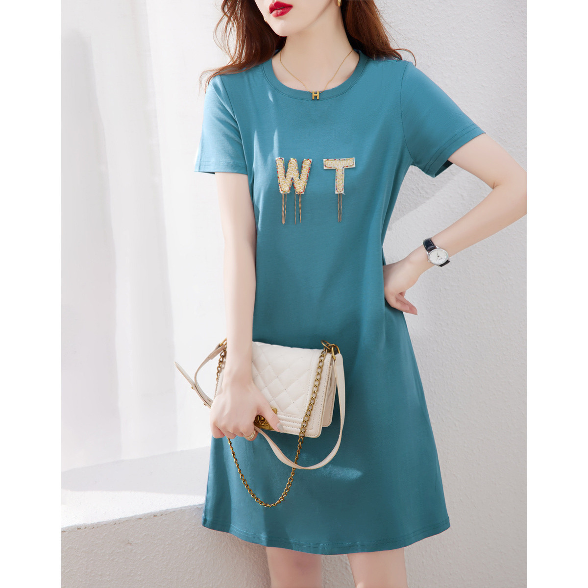 【丝光棉】夏字母串珠流苏圆领短袖针织连衣裙女夏 626881