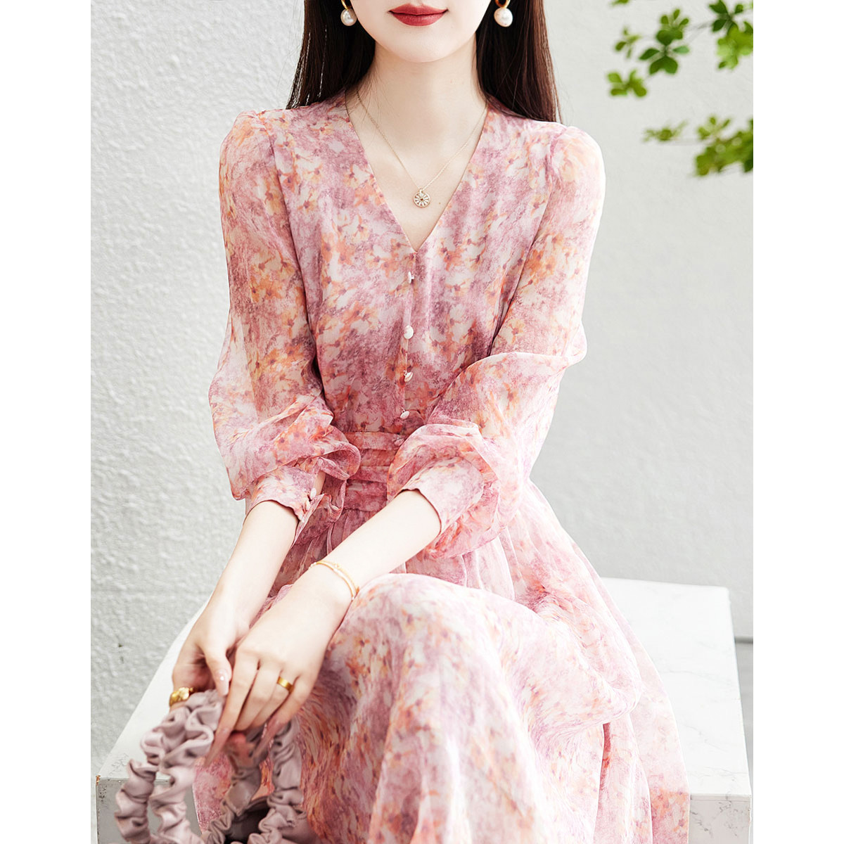 【甜美蘑菇扣】春秋V领印花泡泡袖收腰连衣裙女长款 347905