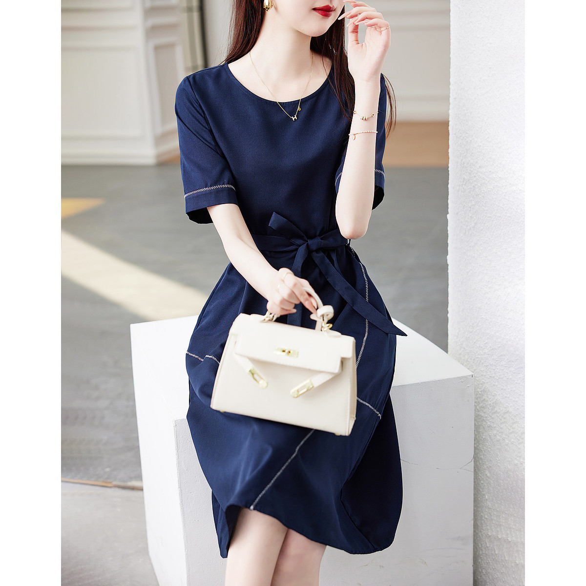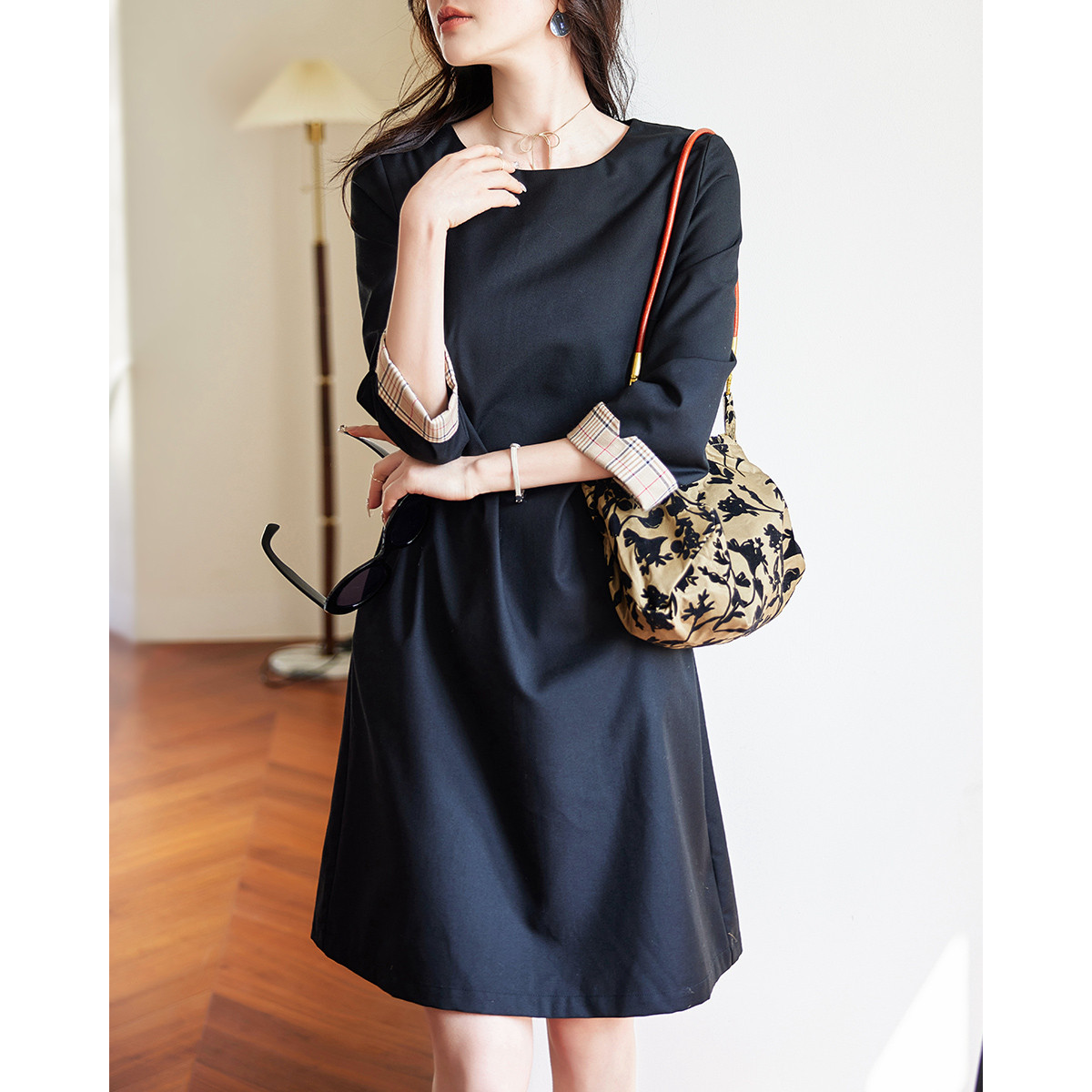【文艺风a字裙】春秋通勤圆领撞色连衣裙女中长款 080769