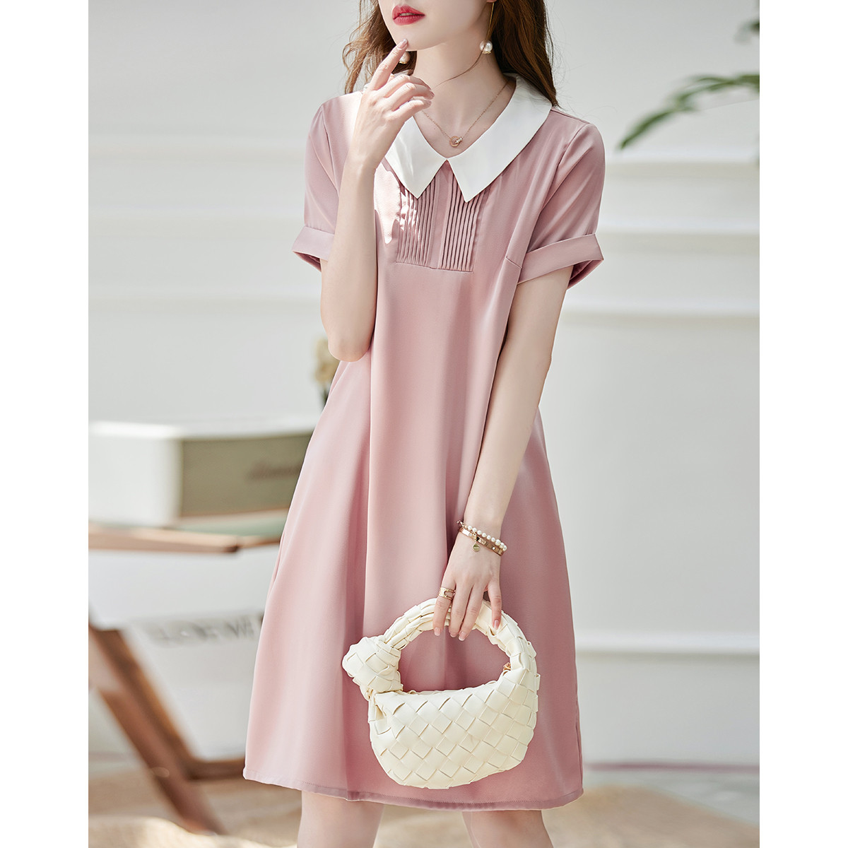 【多巴胺调色盘】夏甜美娃娃领气质风琴褶丝滑舒适遮肉女式连衣裙 452033