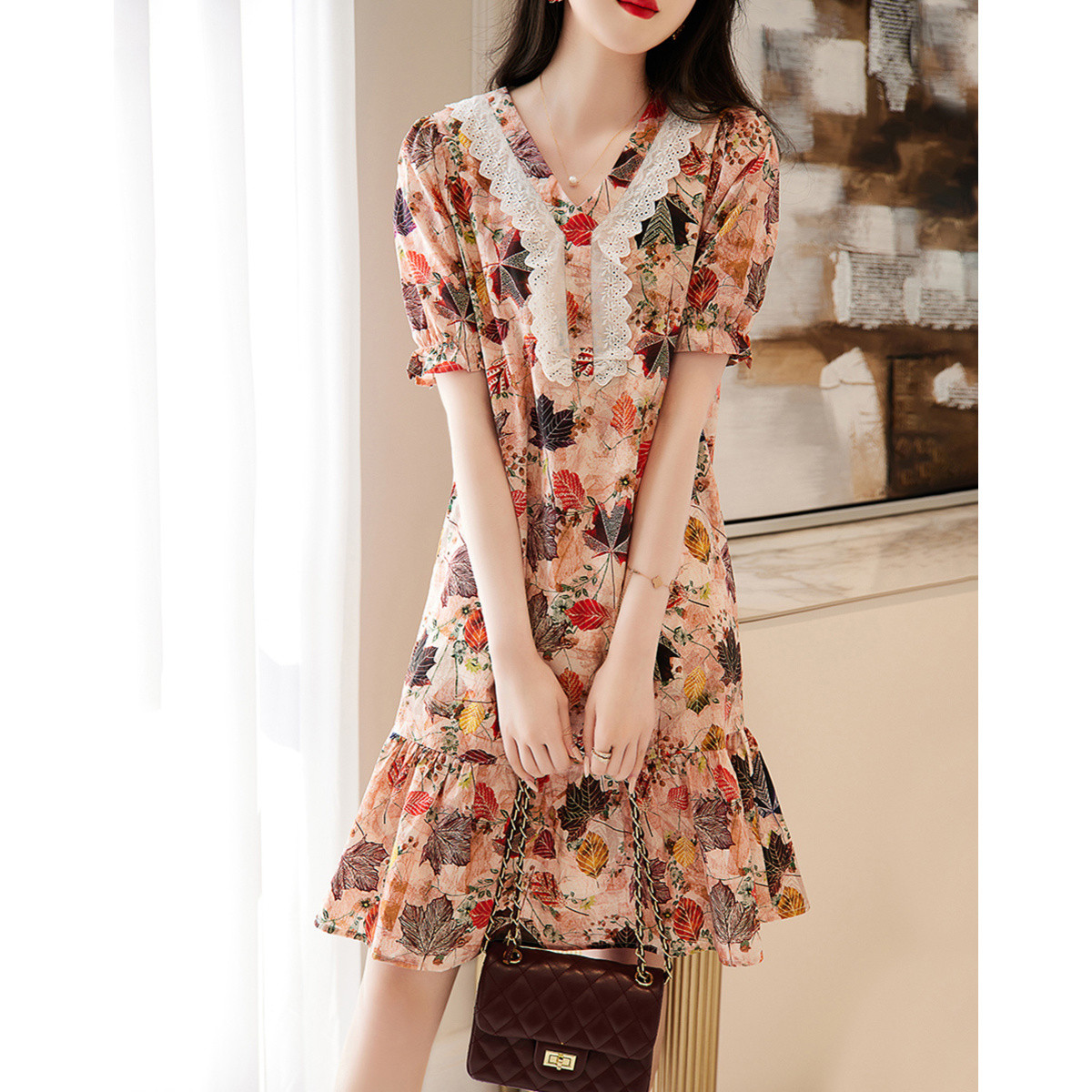 【棉布枫叶印花】夏V领泡泡袖拼接双层蕾丝鱼尾连衣裙女夏 006529