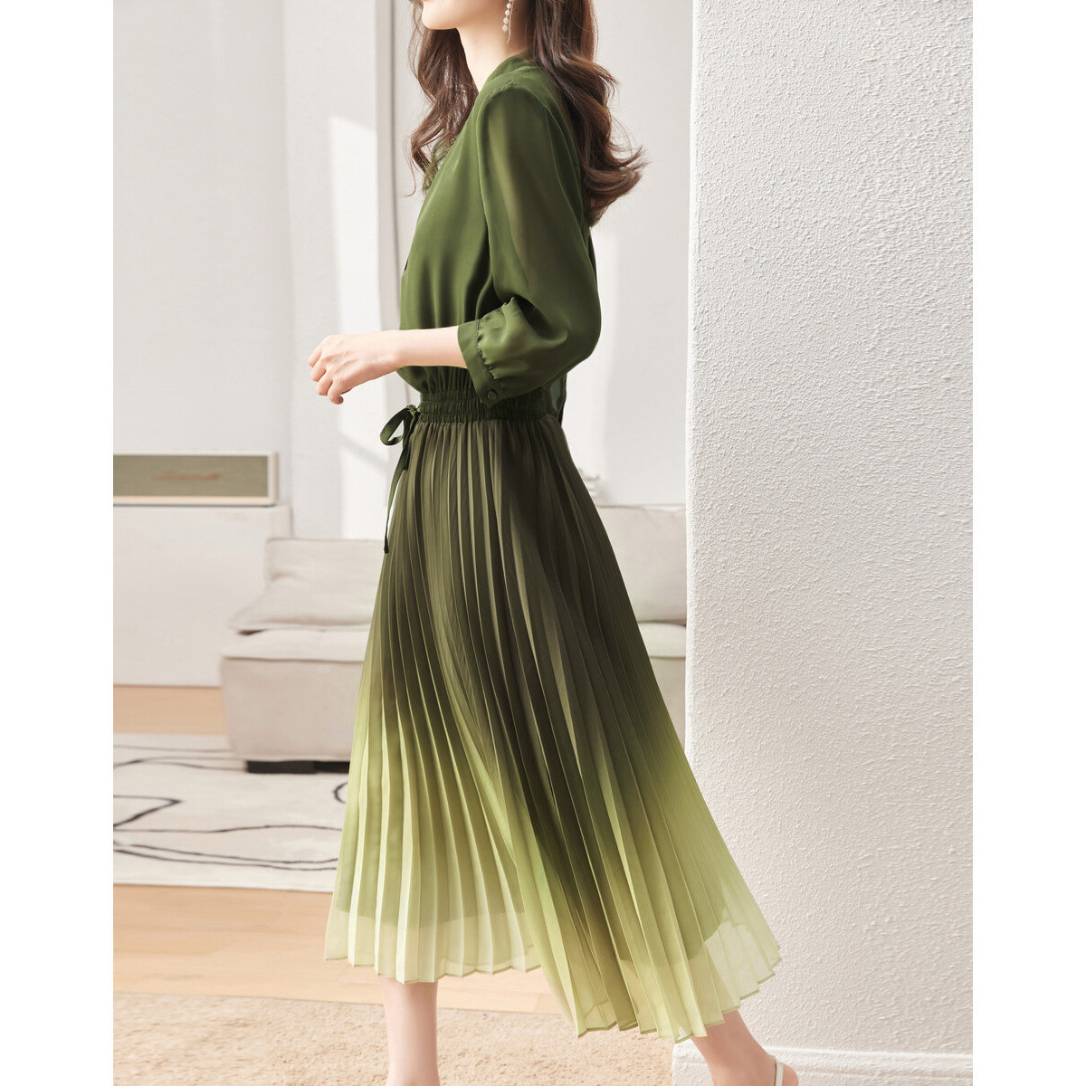 【七分袖伞裙】春秋V领收腰抽褶连衣裙女中长款 538497