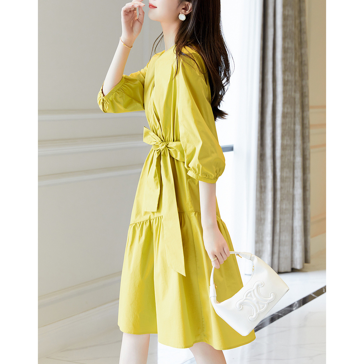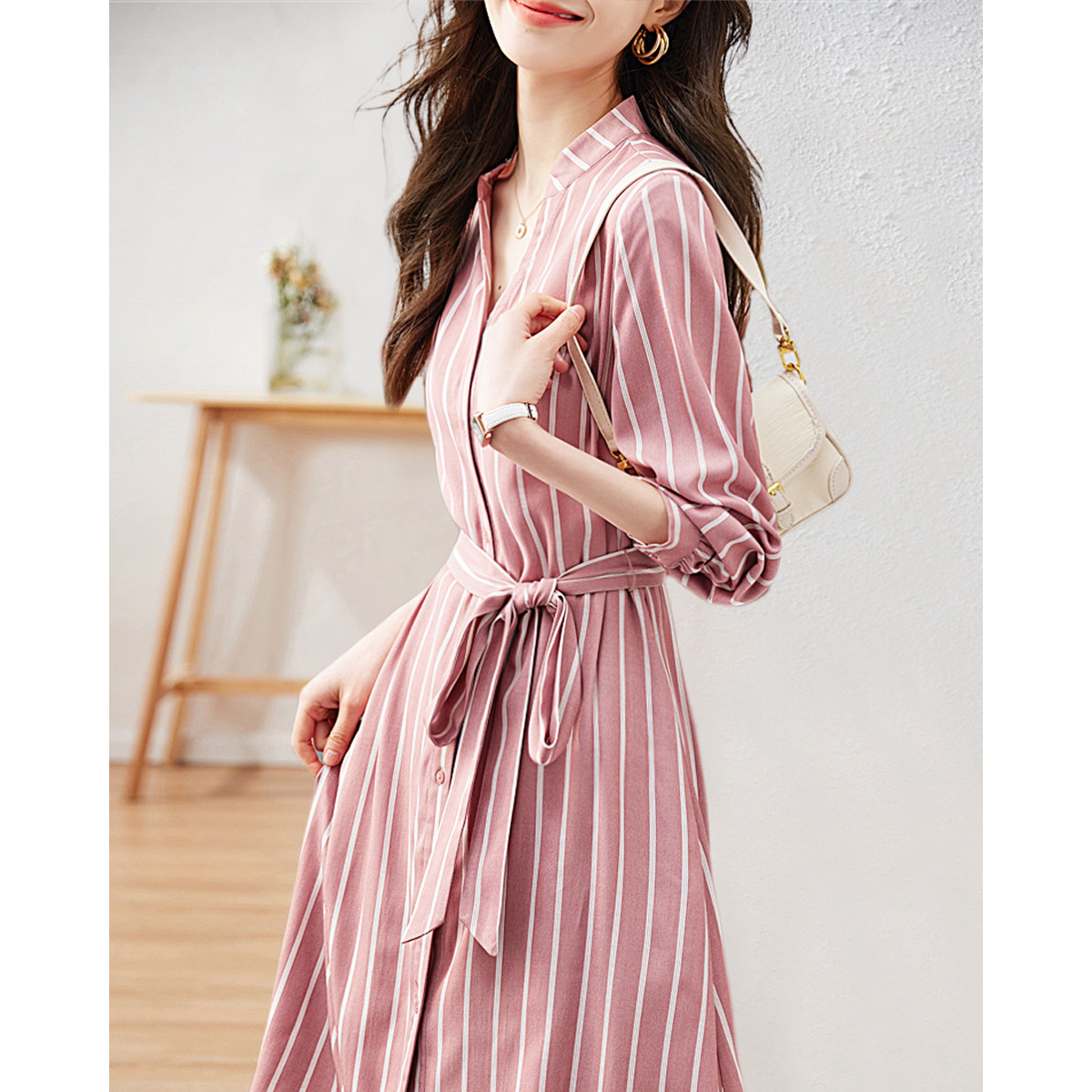 【OL穿搭观察者】春秋法式翻领抽褶绑带收腰优雅衬衫式连衣裙女 451329