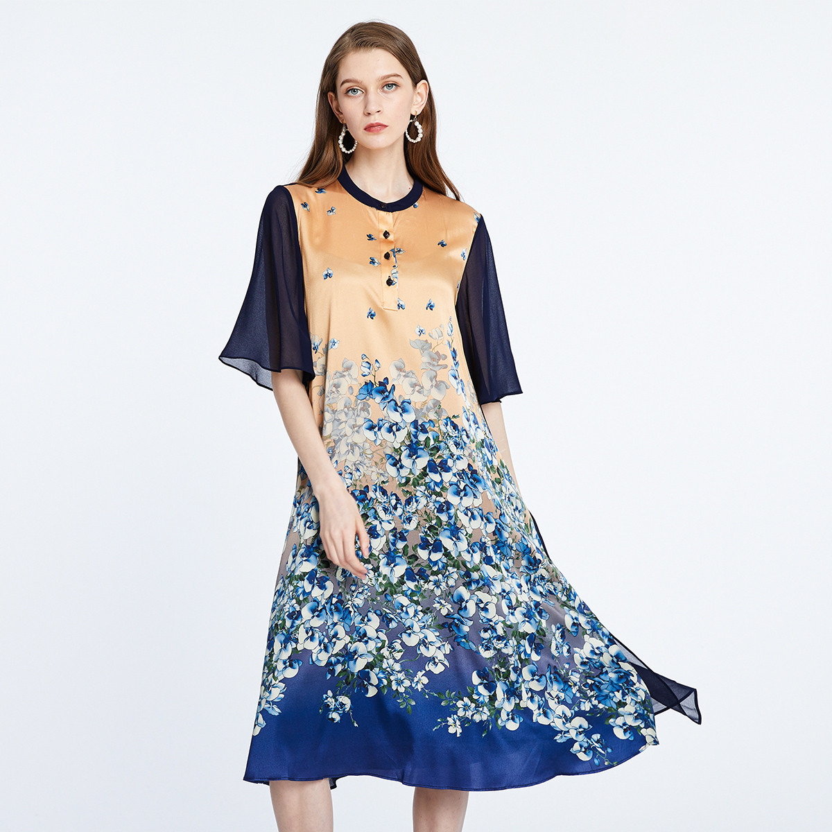 PORTS宝姿春夏女装“晨曦花海”薄纱拼接桑蚕丝连衣裙 524362