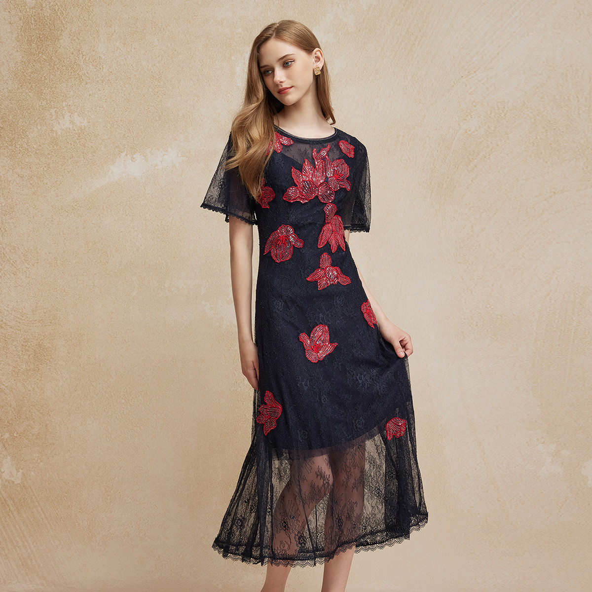 商场同款夏季圆领定位亮片贴花修身显瘦蕾丝优雅气质连衣裙 188255